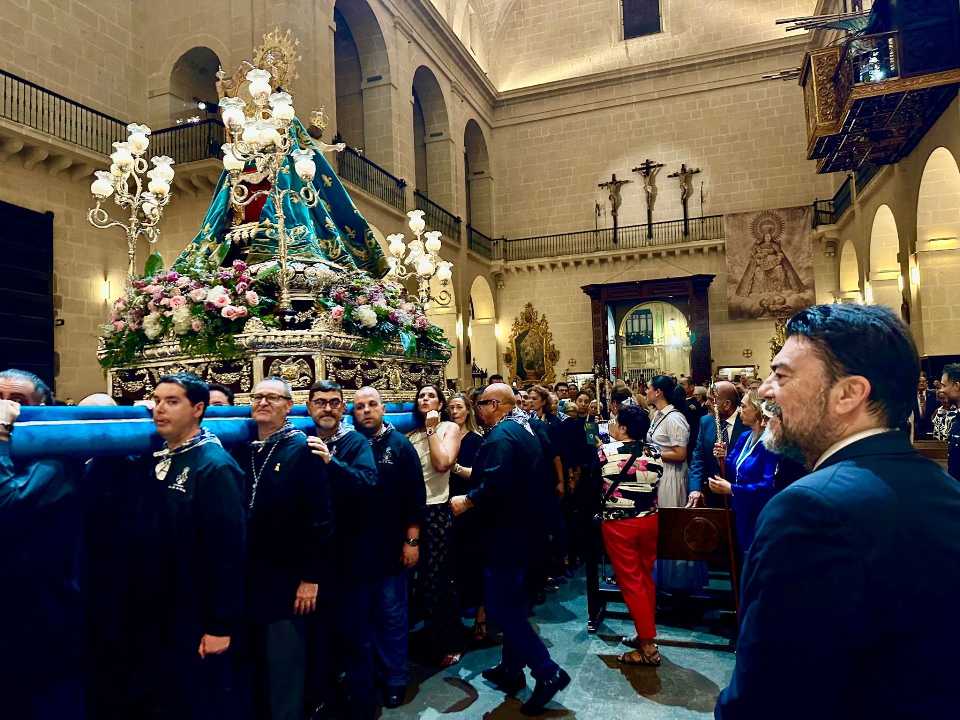 La imagen de la Virgen del Remedio, engalanada con el manto verde agua y la saya marfil bordados en hilo de oro que lució el día de su Coronación Pontificia en 1998, será portada por 60 costaleros con blusón huertano. El cortejo partirá desde la concatedral de San Nicolás a las 20.00 horas, tras la eucaristía presidida por el obispo de Orihuela-Alicante, José Ignacio Munilla.