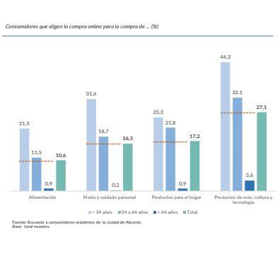 El comercio especializado local es elegido el 40% de los consumidores para las compras de bienes no alimentarios. A mayor edad de los consumidores, más eligen los pequeños establecimientos de proximidad y los mercados. El 90% del gasto en comercio de los alicantinos en bienes no alimentarios se realiza en el comercio de Alicante.