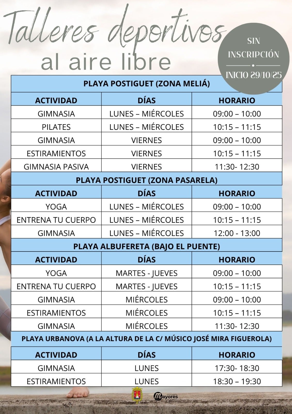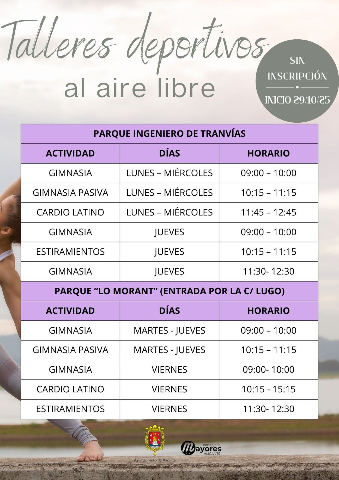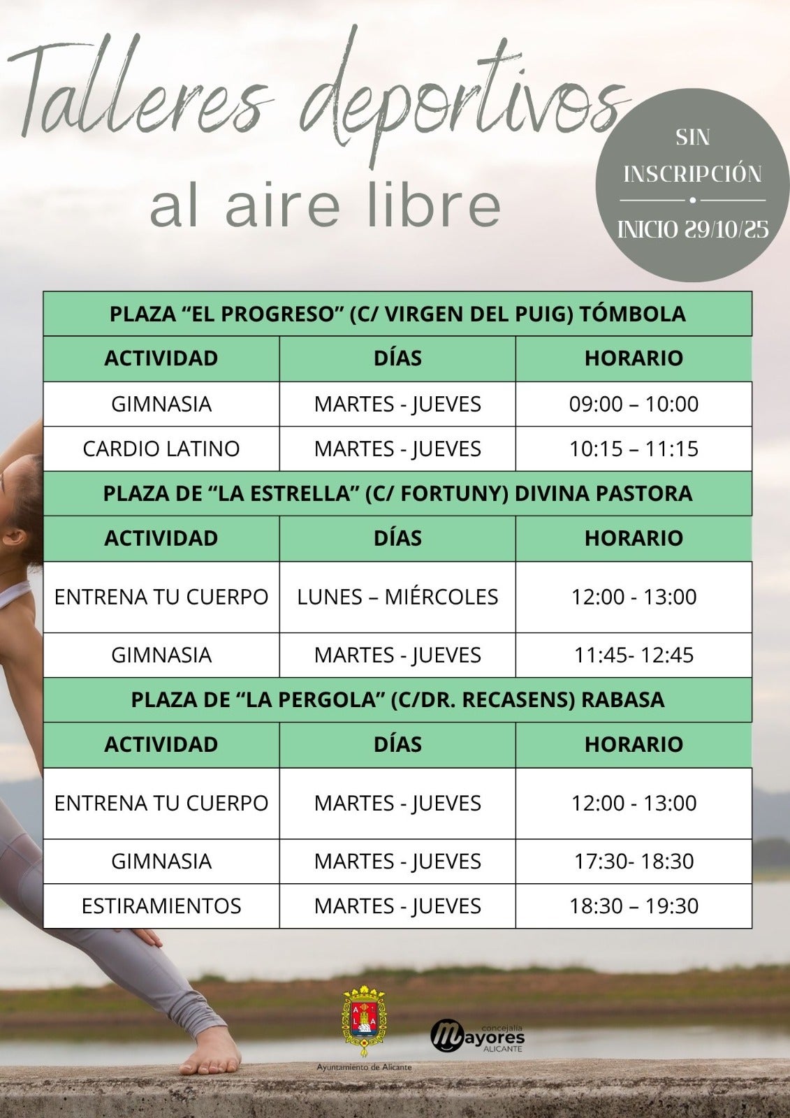 La concejalía ha puesto también en marcha esta semana la programación de talleres deportivos al aire libre, que se desarrollan en los parques Ingeniero de Tranvías y Lo Morant, en las playas del Postiguet, La Albufereta y Urbanova, así como en las plazas El Progreso, La Estrella y La Pérgola.