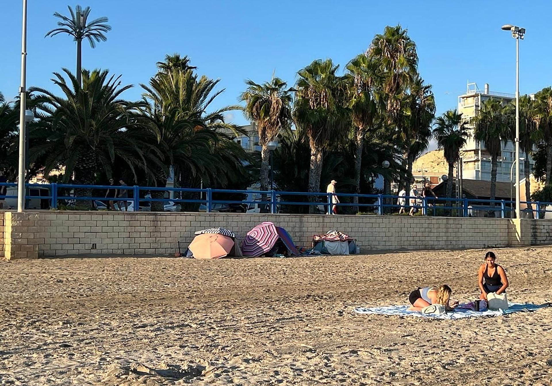 También han aparecido asentamientos en otras zonas, como en la playa del Postiguet, donde desde hace semanas varias personas montan su campamento con sombrillas en una de las zonas de difícil visibilidad desde el paseo, junto al nuevo espigón. Este miércoles fueron desalojadas.