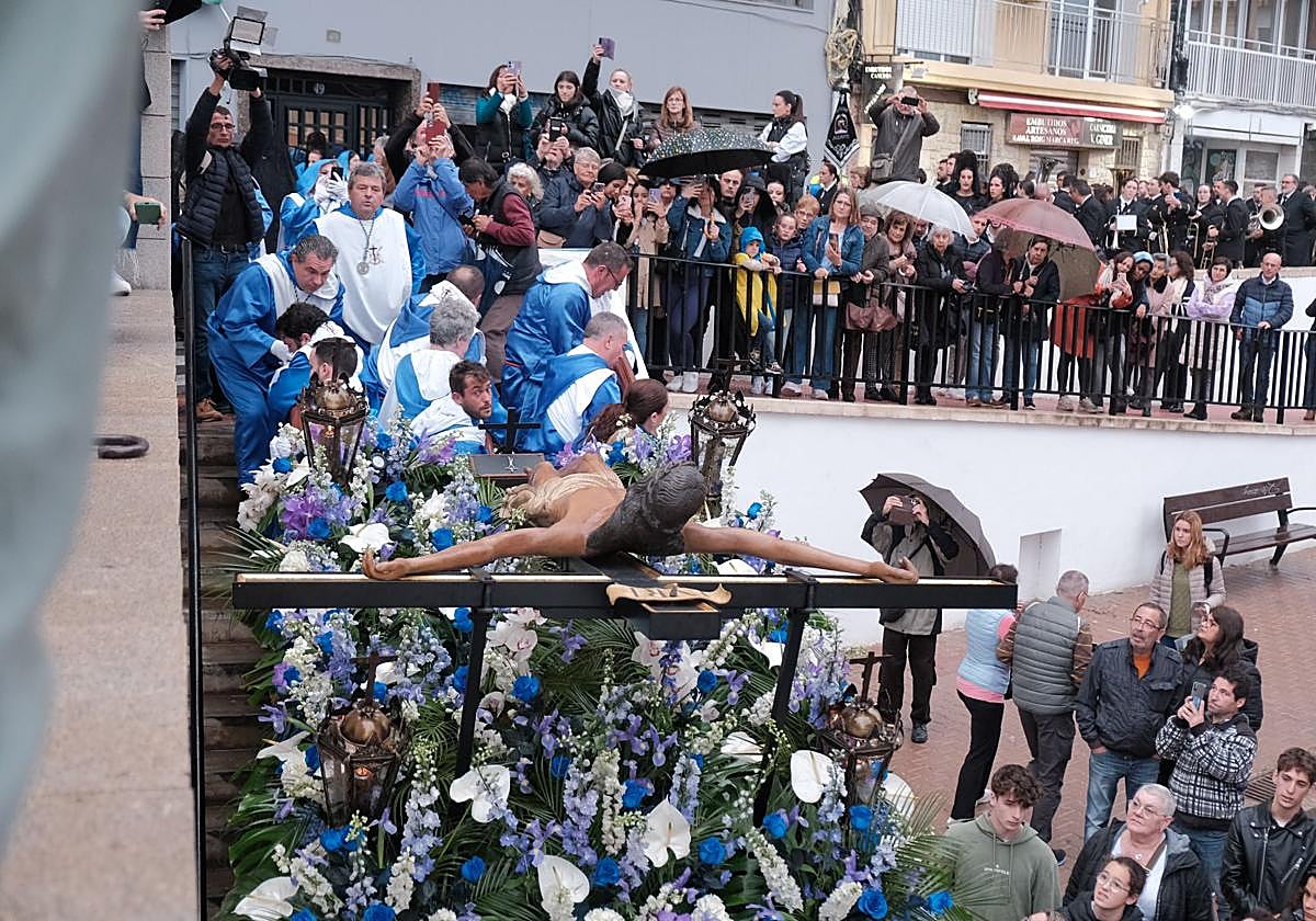 Ante el Cristo del Morenet, sus hermanos de fila, sus damas de mantilla y las autoridades aplaudían el laborioso trabajo que conlleva sacar -por la estrechez de su puerta y el riesgo de su calle- la imagen del templo. Con ellos, un centenar de personas que admiraban el minucioso giro entre barandillas y varales para posicionar esta talla frente a las escaleras que desembocan en la calle Virgen del Socorro.