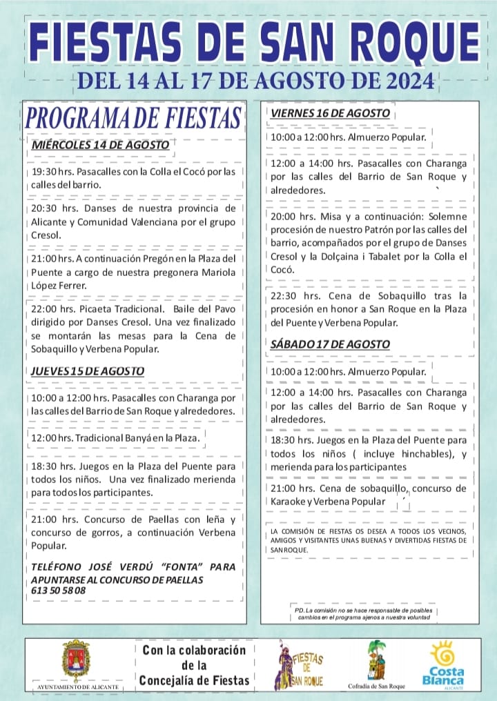 El programa de fiestas del Barrio Obrero, incluido en el calendario de la Federación de Asociaciones Festivas en Barrios y Partidas de Alicante (FAFBA), incluye juegos tradicionales y un conjunto de actividades para todos los públicos. Entre ellas destacan las despertàs, el concurso de fachadas mejor decoradas, la cabalgata de disfraces, tardeos, arroz gigante «para todos», y una verbena con la orquesta 'Athenas' (sábado 17, a partir de las 23.30 horas).