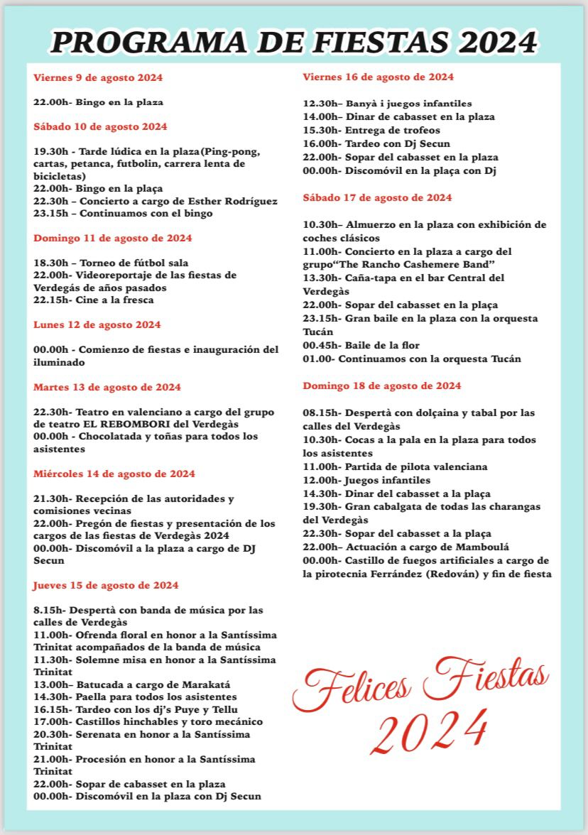 Los actos en honor a la Santísima Trinidad se suceden en Verdegás desde este jueves, 15 de agosto, hasta el domingo 18 se suceden los actos. El primero de estos días está dedicado a honrar a la patrona. A partir de ahí se irán sucediendo actividades como como batucadas, paellas, tardeos, discomóvil, exhibición de coches clásicos, conciertos, caña-tapa, baile con orquesta, despertàs, y cabalgata en la que participan todas las charangas de Verdegás (domingo 18, a las 19,30 horas).