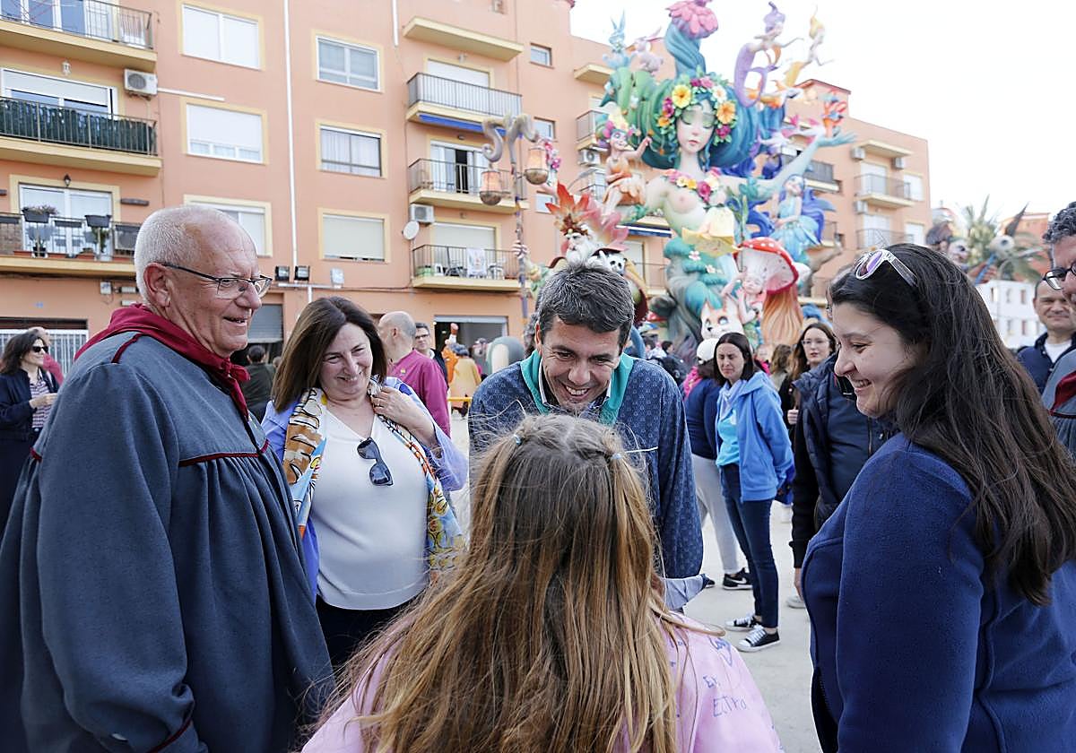 El presidente de la Generalitat, Carlos Mazón, ha visitado distintas comisiones falleras de Dénia acompañado por las Falleras Mayores Mar Moncho y Candela Marco, sus cortes de honor y el alcalde de la localidad, Vicent Grimalt.