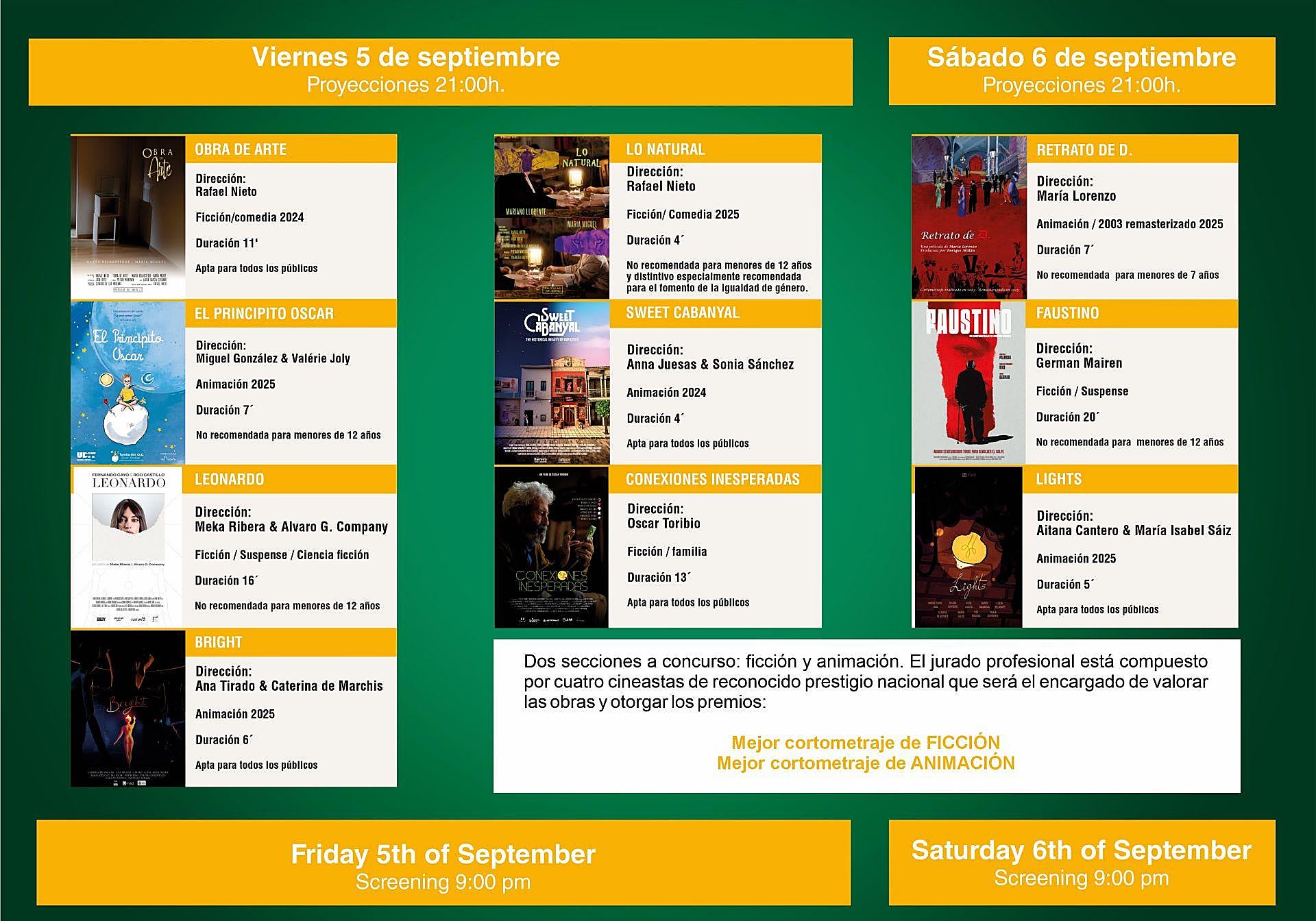 Las proyecciones del viernes 5 de septiembre son aptas para mayores de 12 años; mientras que las del sábado 6 lo son para niños de a partir de los 10 años. Antes de cada cortometraje los directores hablarán sobre su creación al público.