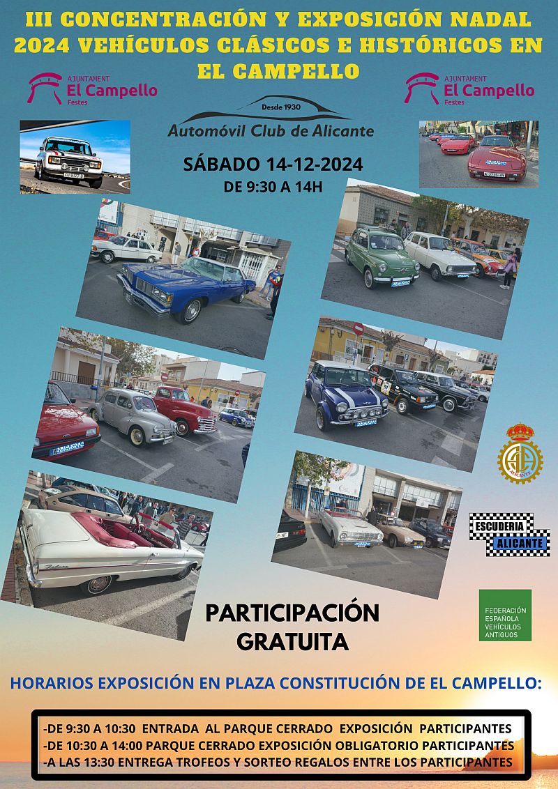 El Ayto. de El Campello, coordinado por la Concejalía de Eventos y con la organización del Automóvil Club de Alicante, Club decano del Automovilismo en la Comunidad Valenciana, han preparado una jornada lúdico festiva, integrada dentro del programa de «Festes de Nadal 2024», para el sábado 14 de Diciembre junto al Aula de Cultura, en la Pza. de la Constitución y calles adyacentes, durante la que los vecinos del municipio podrán deleitarse con las joyas rodantes del siglo pasado que son los vehículos clásicos e históricos, tanto coches, como motos, como cualquier otro tipo de vehículo que tenga más de 25 años.