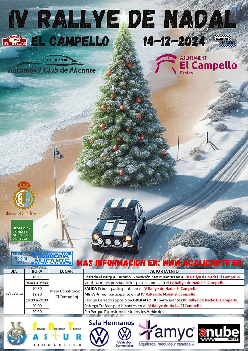 Por un lado, a las 08:00h del sábado 14 de diciembre, llegarán los participantes en el «IV Rallye de Nadal El Campello 2024», coches clásicos deportivos que, tras las oportunas comprobaciones por parte de la organización, quedarán aparcados en la C/ Pio XII, junto al Aula de Cultura de El Campello, hasta que tomen la Salida a partir de las 10:30h., de minuto en minuto cada uno, para realizar un recorrido de más de 230 Km a una velocidad media menor de 50 Km/h por la montaña de la provincia de Alicante, realizando 12 Tramos de Clasificación en modo Regularidad.