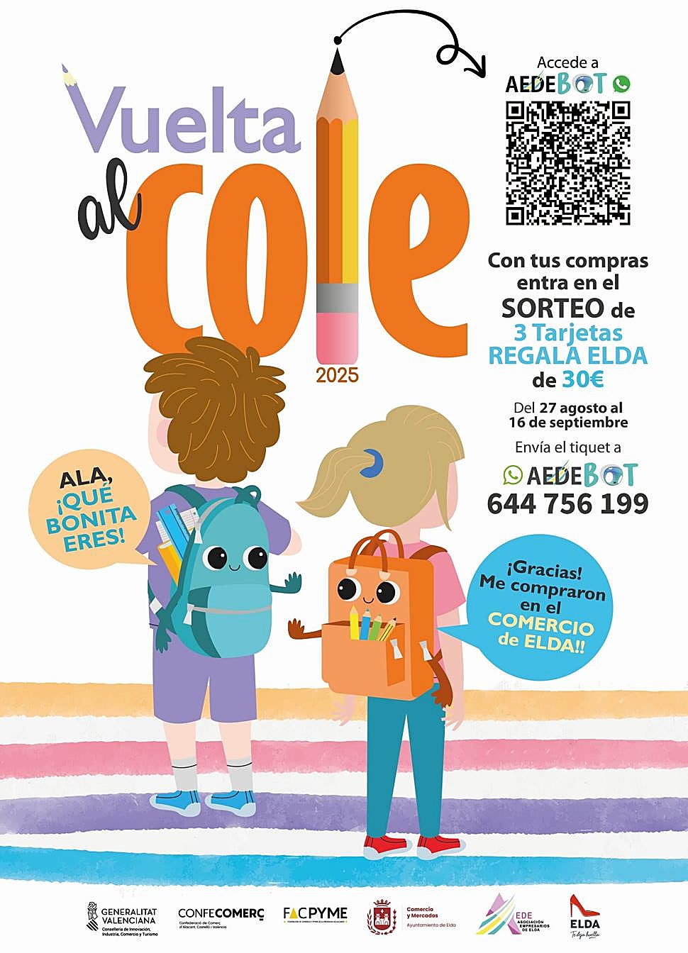 Desde ayer 27 de agosto y hasta el próximo 16 de septiembre, todas las compras que se realicen en comercios de Elda adscritos a la campaña 'Vuelta al Cole 2025' podrán participar en el sorteo de 3 tarjetas Regala Elda con 30 euros cada una.