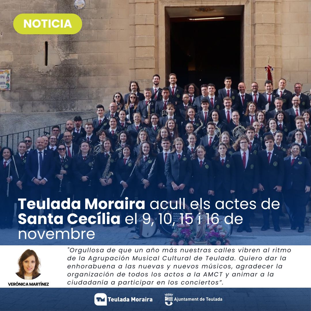 La Agrupación Musical Cultural de Teulada (AMCT), en colaboración con el Ayuntamiento de Teulada, vuelve a celebrar un año más Santa Cecilia, patrona de la música y de los músicos. Durante los días 9, 10, 15 y 16 de noviembre, el municipio acogerá diferentes conciertos de la AMCT y celebrará el día principal con la misa y bienvenida a las nuevas y nuevos músicos de la banda.