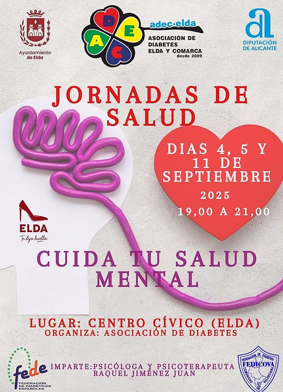 Un ejemplo de estas acciones es la que llevará a cabo la Asociación de Diabetes de Elda y Comarca en colaboración y con el apoyo del Ayuntamiento de Elda y la Diputación de Alicante. La actividad consiste en unas jornadas que bajo el nombre 'Cuida tu salud mental' que tendrán lugar los días 4, 5 y 11 de septiembre en el Centro Cívico y Juvenil.