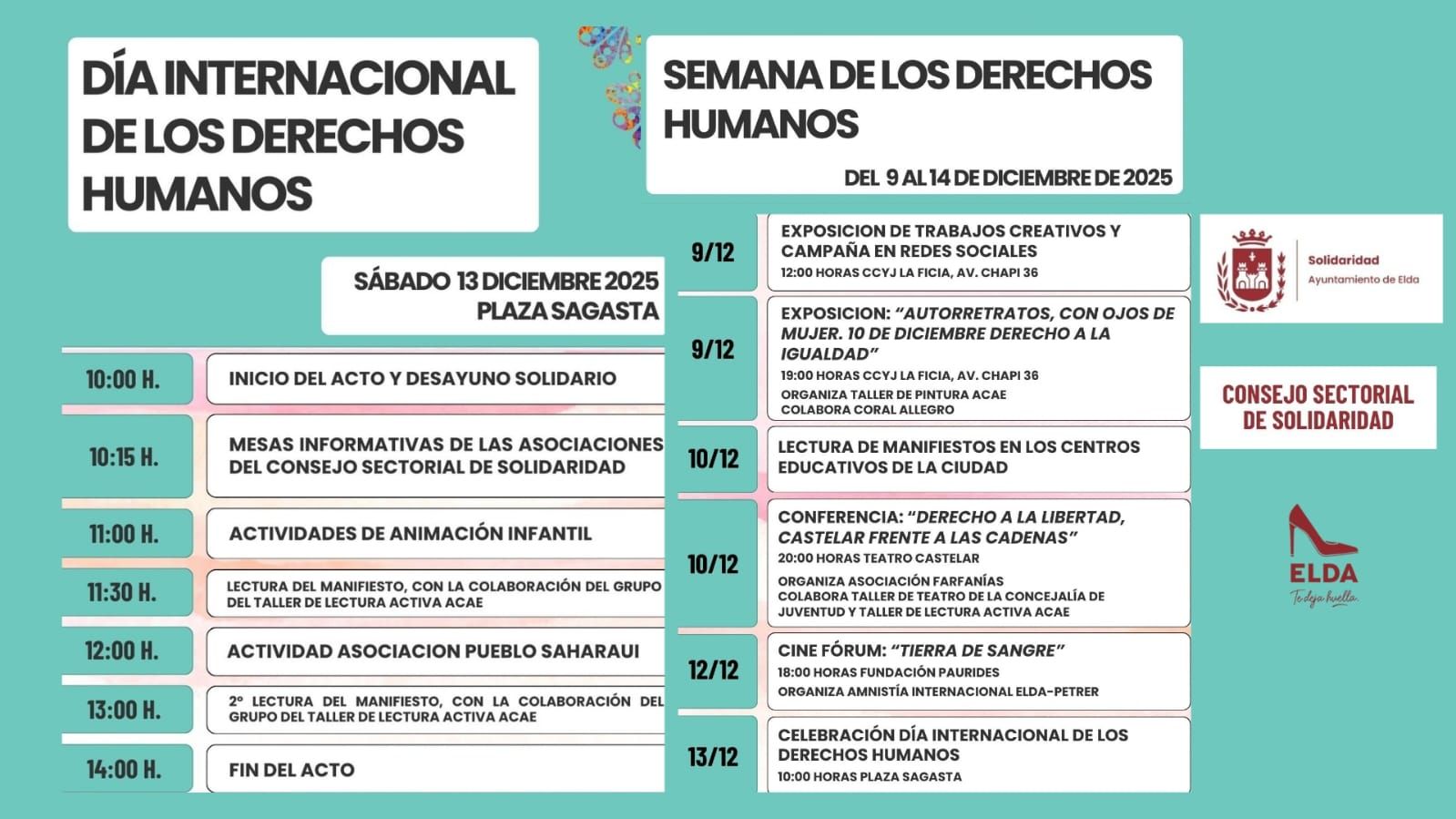 El Ayuntamiento de Elda, a través de la Concejalía de Solidaridad, organiza un año más la Semana de los Derechos Humanos, una cita que incluye una amplia programación de actividades que tendrán su colofón final el sábado 13 de diciembre con la celebración de la Feria de los Derechos Humanos en la que participarán las ONGD de la ciudad.