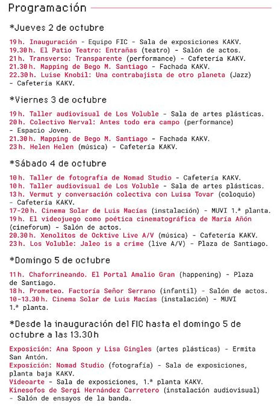 Este FIC se celebrará en la Casa de la Cultura, en la Ermita de San Antón, la Plaza de Santiago y el propio MUVI. Uno de los tres comisarios artísticos del FIC, Andrés Leal ha destacado la presencia de personalidades de gran nivel, y la participación de los creadores locales más reputados y con mayor proyección. Esta mezcla, desde su punto de vista, «es parte de la riqueza del FIC, que muestra tendencias futuras en diferentes disciplinas artísticas».