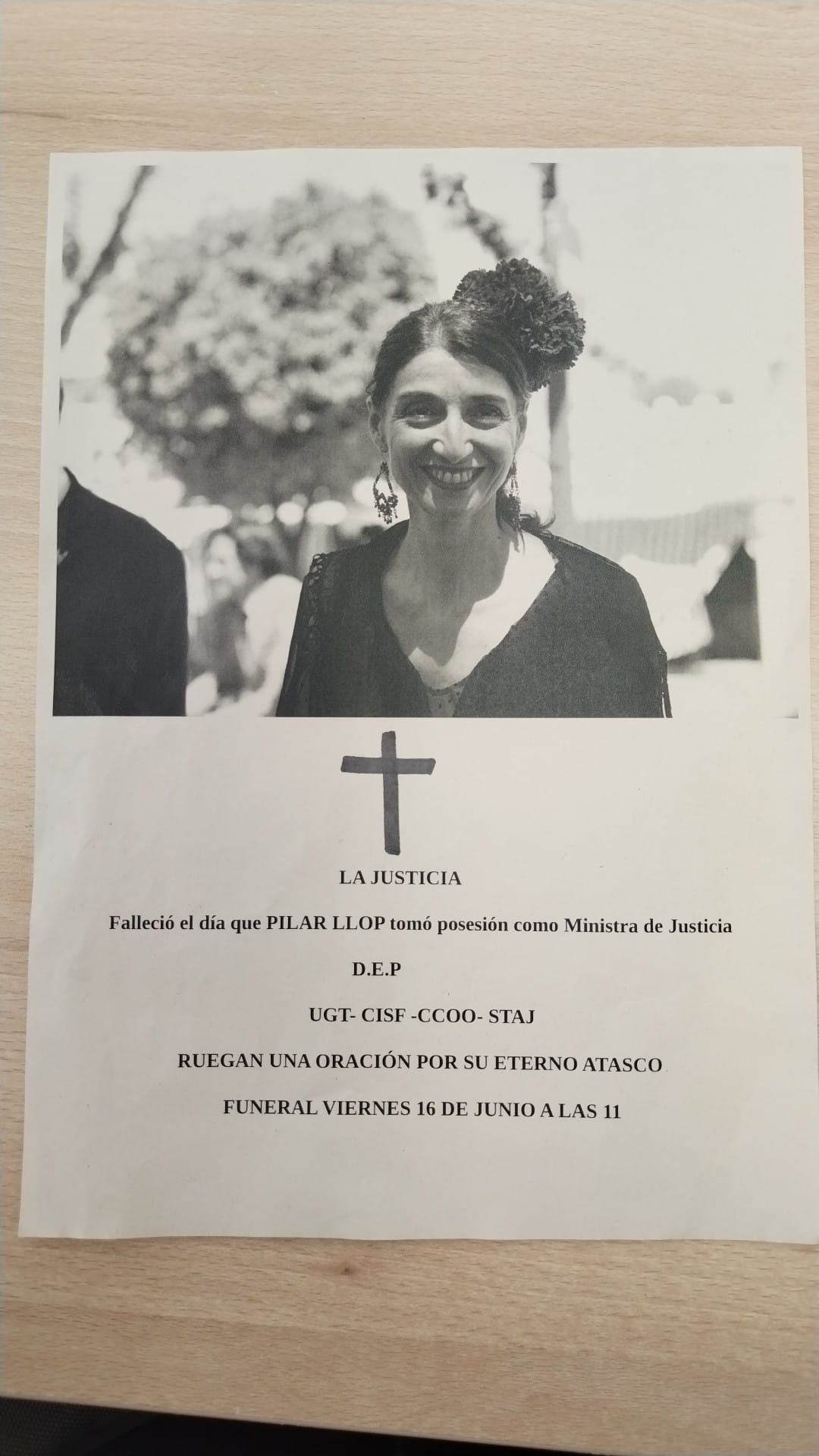 Desde el colectivo laboral han denunciado la situación laboral que están sufriendo. Como ocurrió en el anterior paro indefinido de los letrados de la Administración de Justicia (LAJ), todas las críticas apuntan a la misma figura: la ministra Pilar Llop, cuya imagen ha sido colocada en una esquela con la frase: «La Justicia falleció el día que Pilar Llop tomó posesión como ministra». «UGT, CSIF, CC OO y STAJ ruegan una oración por su eterno atasco».