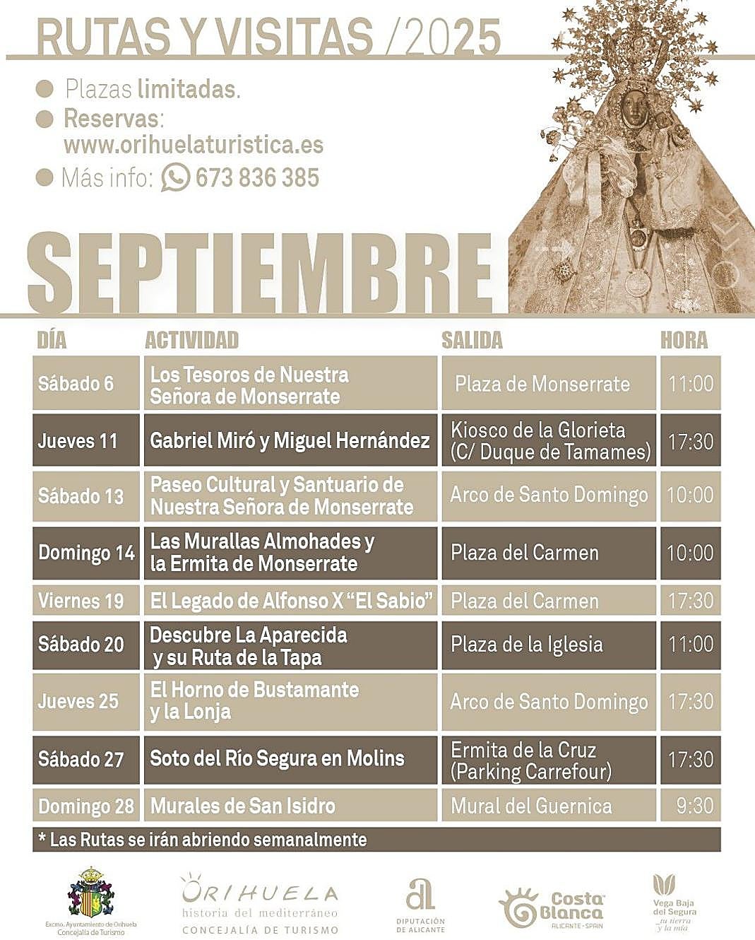 «Septiembre es un mes muy especial para Orihuela porque celebramos a nuestra patrona, la Virgen de Monserrate, y desde la Concejalía de Turismo hemos querido que esta devoción se refleje también en la programación de nuestras rutas», ha destacado el edil de Turismo del municipio, Gonzalo Montoya.