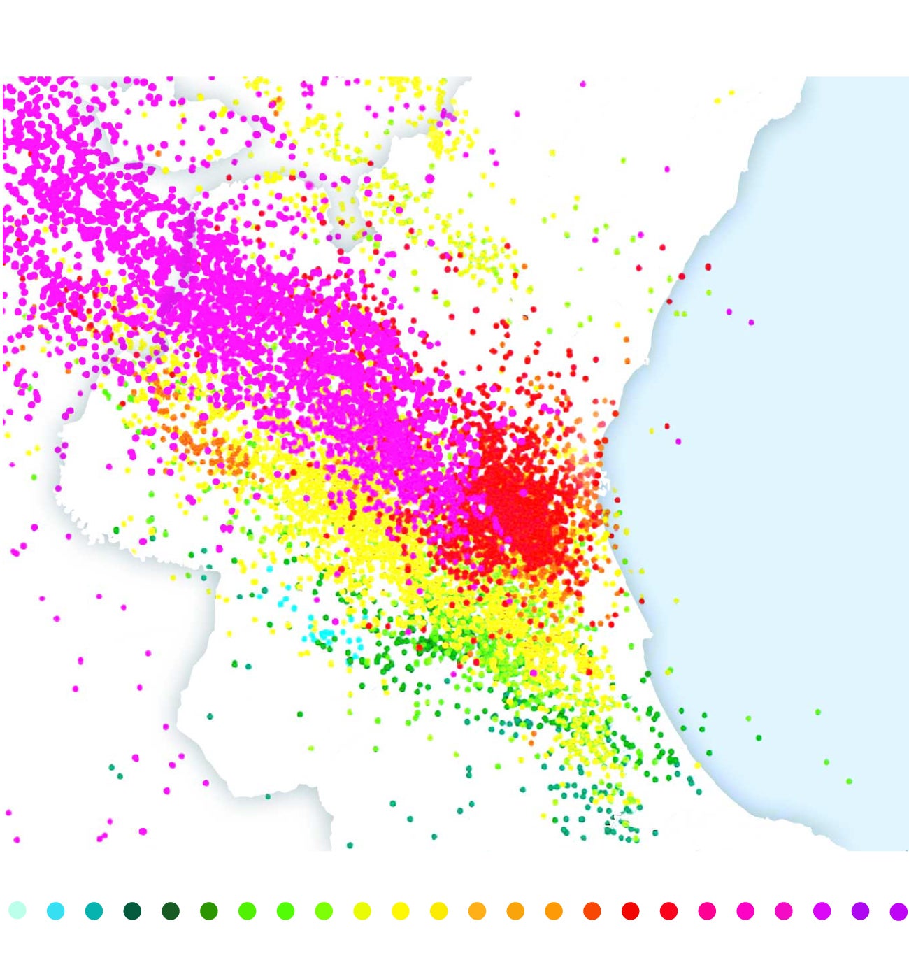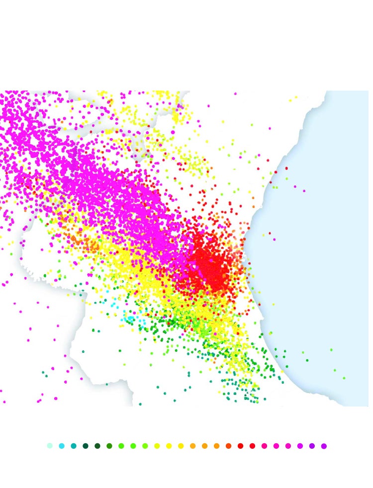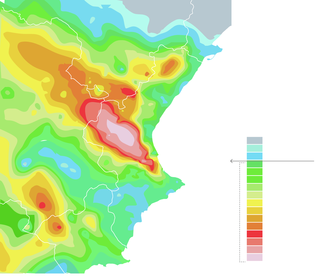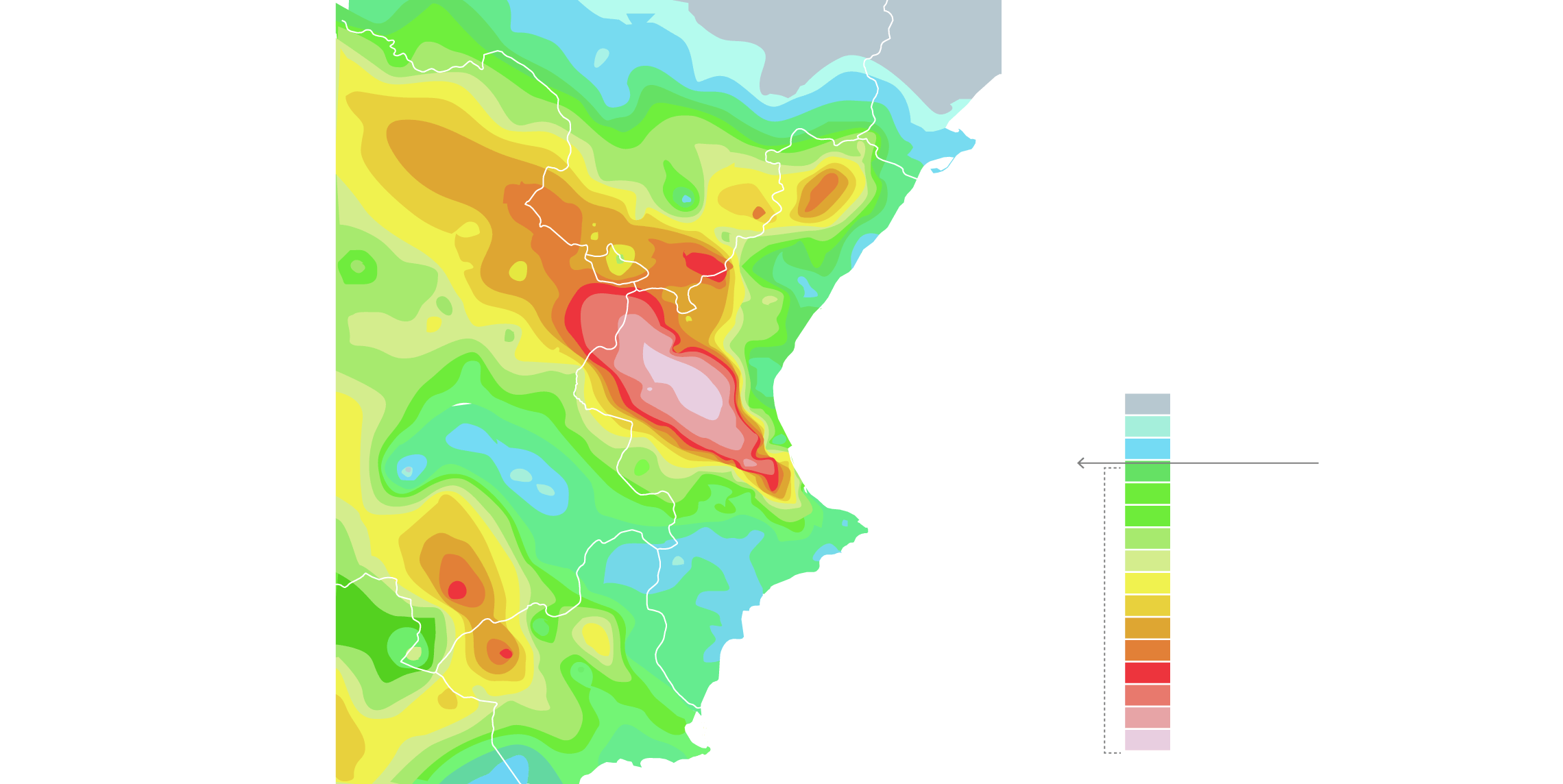 El mapa de precipitación acumulada de aquel fatídico martes pone en evidencia el extraordinario gradiente pluviométrico, con zonas que pasaron de más de 300 l/m² a menos de 20 l/m² en apenas 20-30 km. Por ejemplo, mientras el interior de Valencia se teñía de morado, el litoral central y norte, incluida la ciudad de València, aparece en tonos verdes y azules, indicando registros muy por debajo de los máximos.