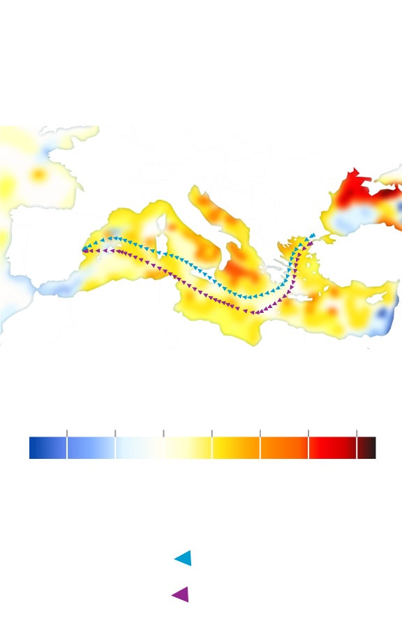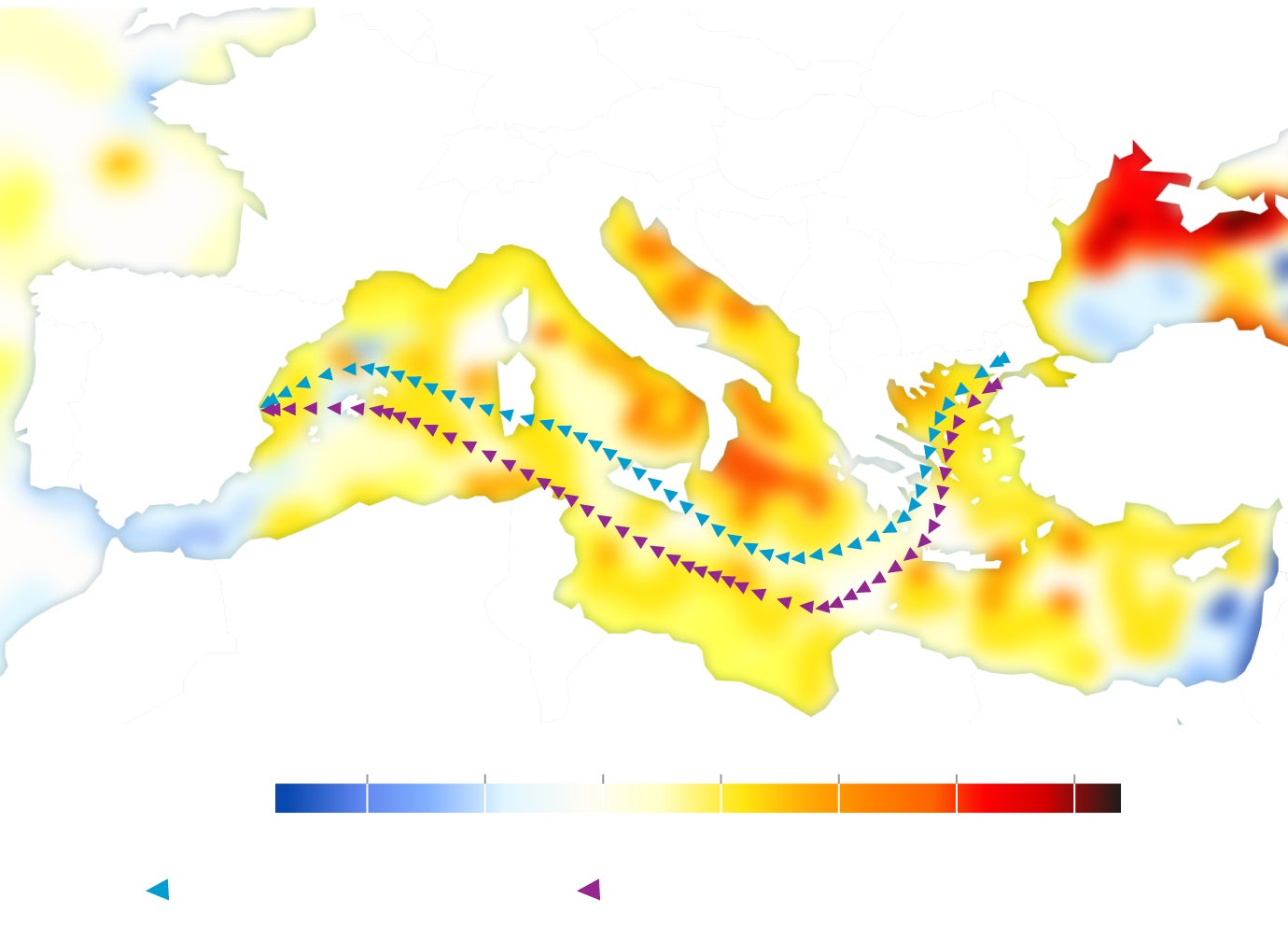 Del mar Egeo a la Comunitat. La masa de aire que llegó a Valencia el día 29 había recorrido todo el Mediterráneo en los cuatro días previos. Un viaje por zonas marítimas con anomalías de temperatura de hasta más dos grados.
