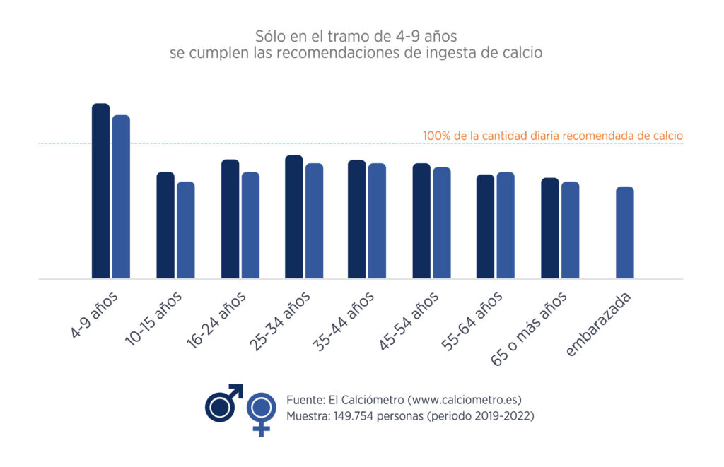 Ahora bien, el tipo de leche también resulta determinante a la hora de cumplir con la ingesta de calcio diario necesario. Según los datos de “El Calciometro” recopilados entre 2019 y 2022, cuando la leche consumida es clásica (ya sea entera, semidesnatada o desnatada), sólo el tramo de edad de 4 a 9 años alcanza las recomendaciones diarias de calcio. El resto de los tramos de edad se encuentra muy por debajo de las recomendaciones, en torno al 80 % de la pauta ideal. Resulta especialmente preocupante el caso de las mujeres embarazadas, quienes apenas alcanzan el 67 % de la recomendación. Por otro lado, los datos recabados constataron que conforme pasan los años, la ingesta de calcio es cada vez menor, quedando así más lejos de las recomendaciones.