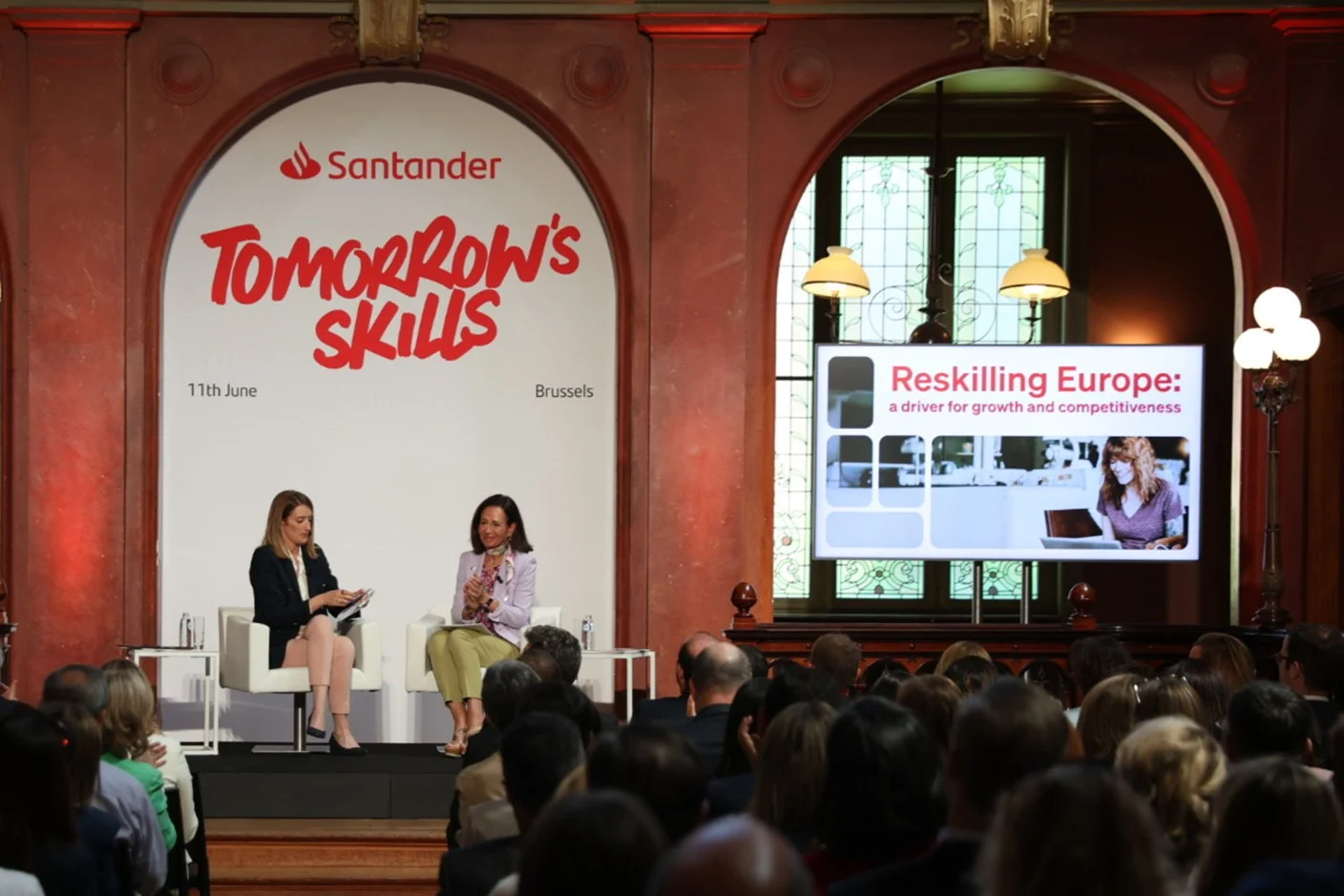 Ana Botín, presidenta ejecutiva de Banco Santander y Roberta Metsola, presidenta del Parlamento Europeo, presentando en Bruselas el informe "Habilidades del Futuro".