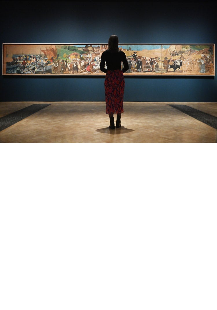 Con unos 3,5 metros de alto y 60 metros de largo es una de las obras monumentales del artista valenciano. Compuesta por 14 pinturas que, a modo de fotogramas de una compleja trama de actualidad, retrata un país a punto de desaparecer, como dijera el propio artista.