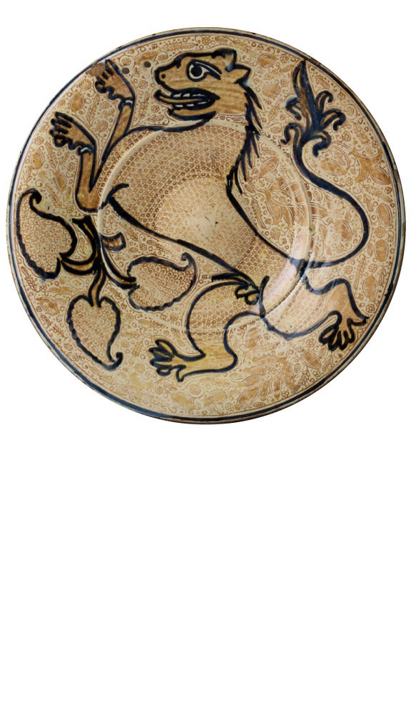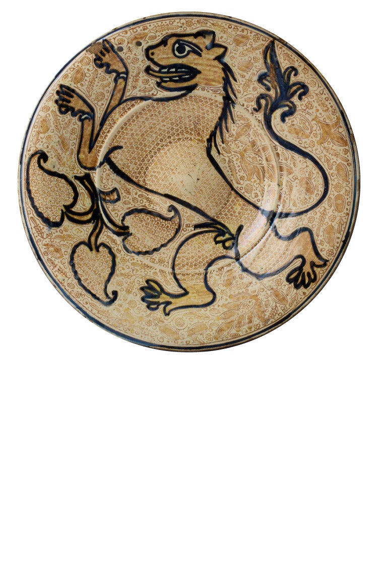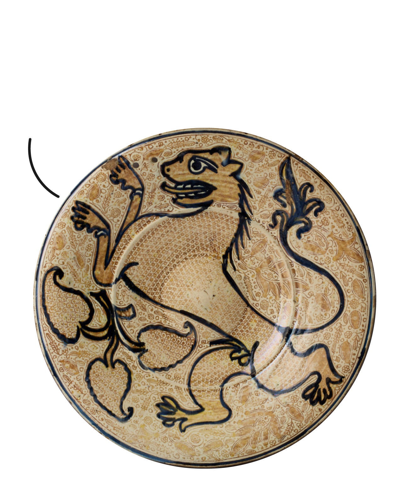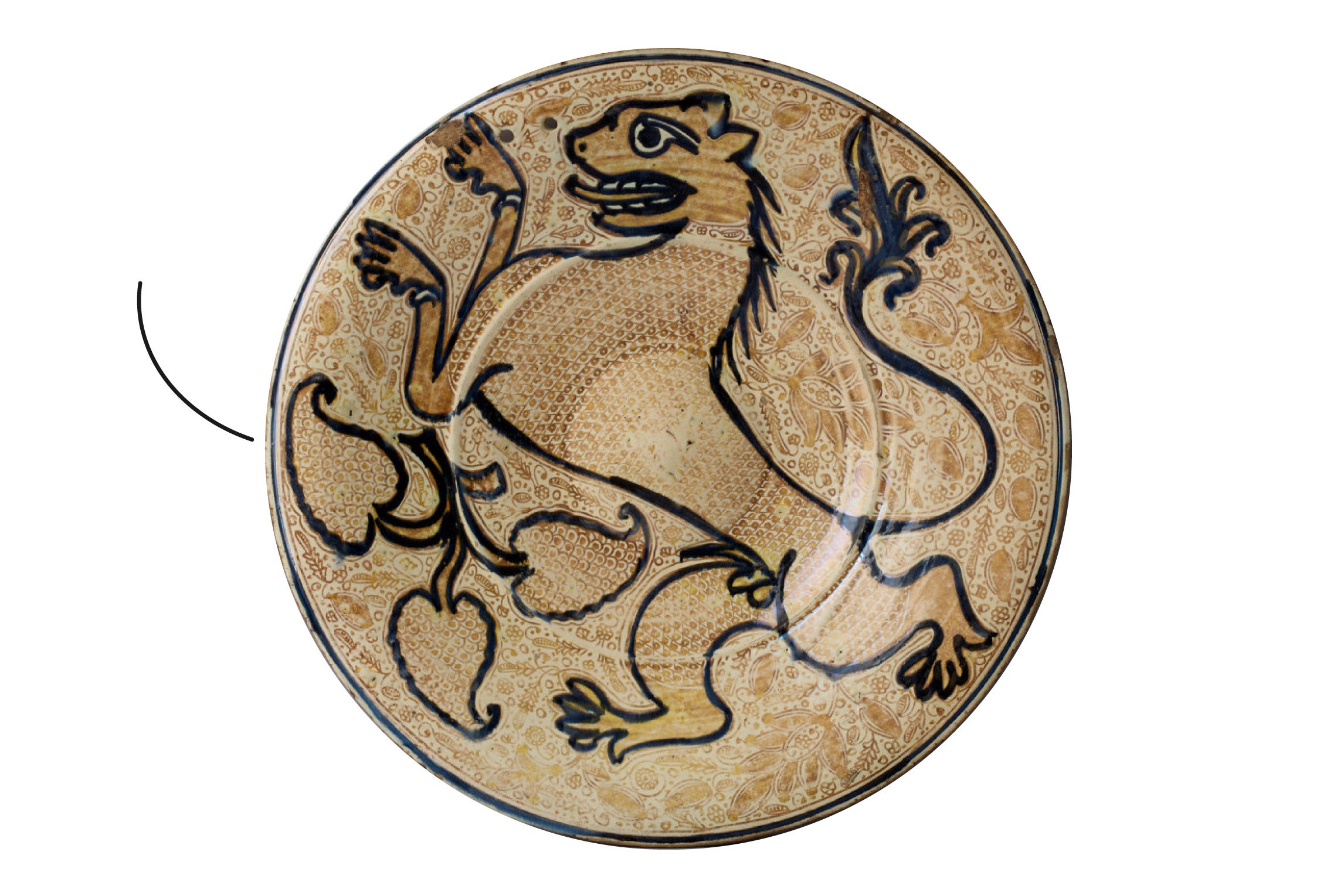 En perfecto estado de conservación, esta pieza de arte decorativo de 47,5 cm de diámetro se esculpió en cerámica vidriada con estaño, cobalto y brillo.