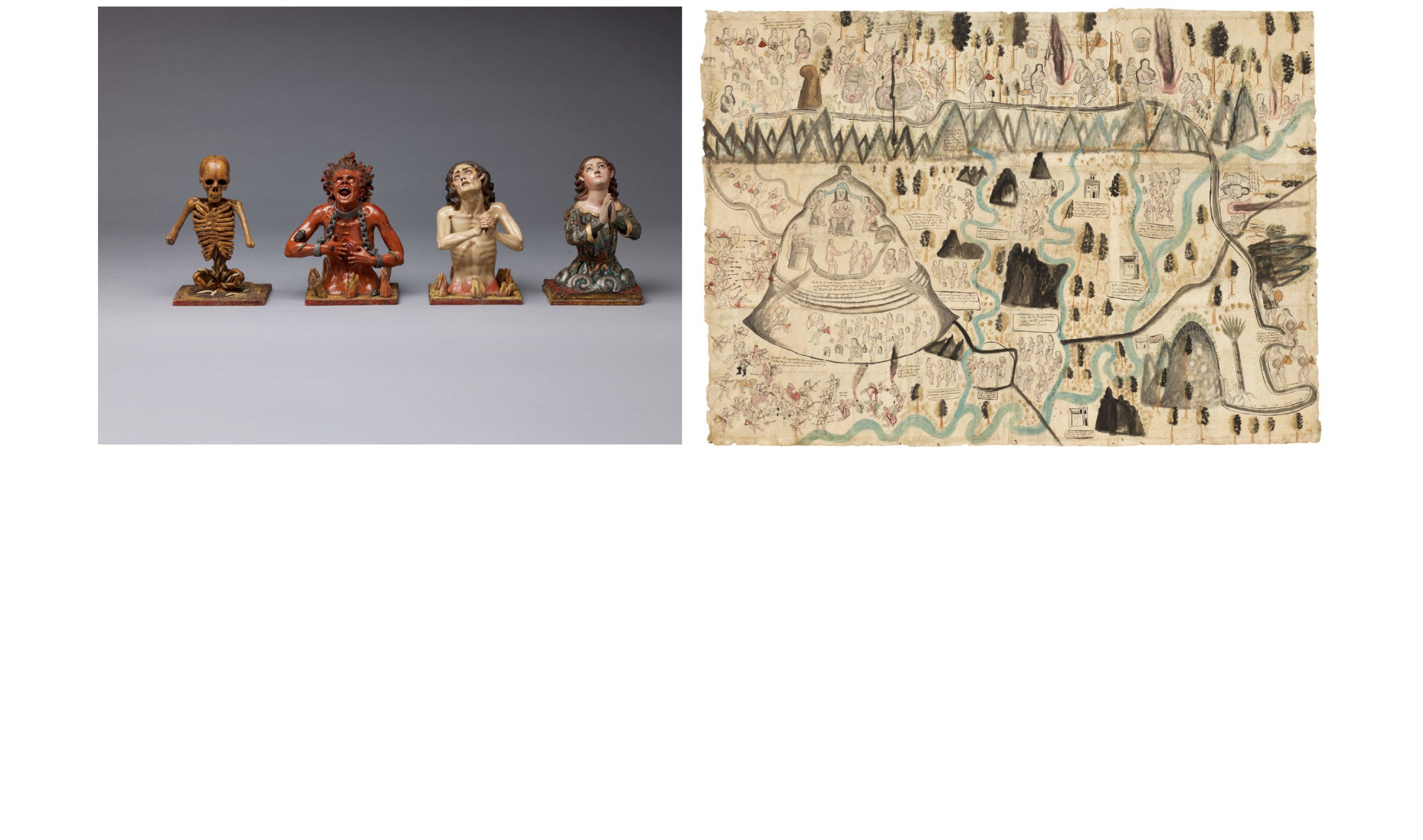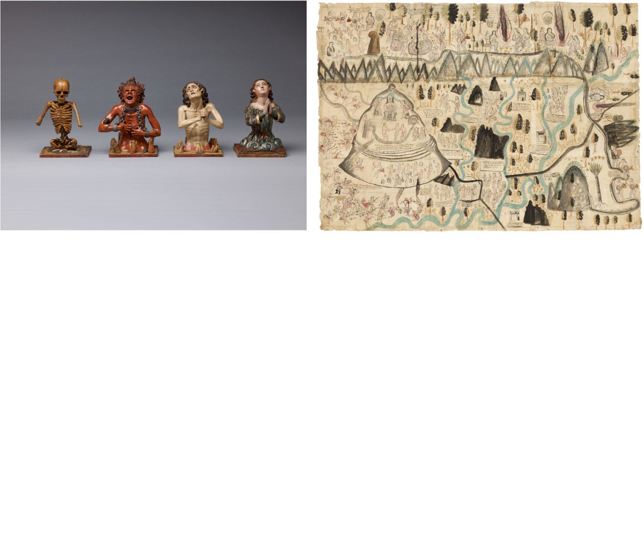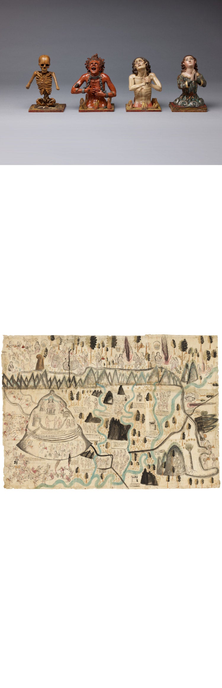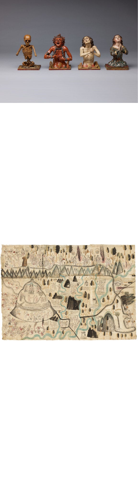 La muerte, el alma en el infierno, el alma en el purgatorio y el alma en el cielo son los nombres de las estatuillas de madera policromada, cristal y metal. Han sido atribuidas a este escultor quiteño bajo el influjo del arte y la ideología española. Miden unos 17 centímetros de alto.