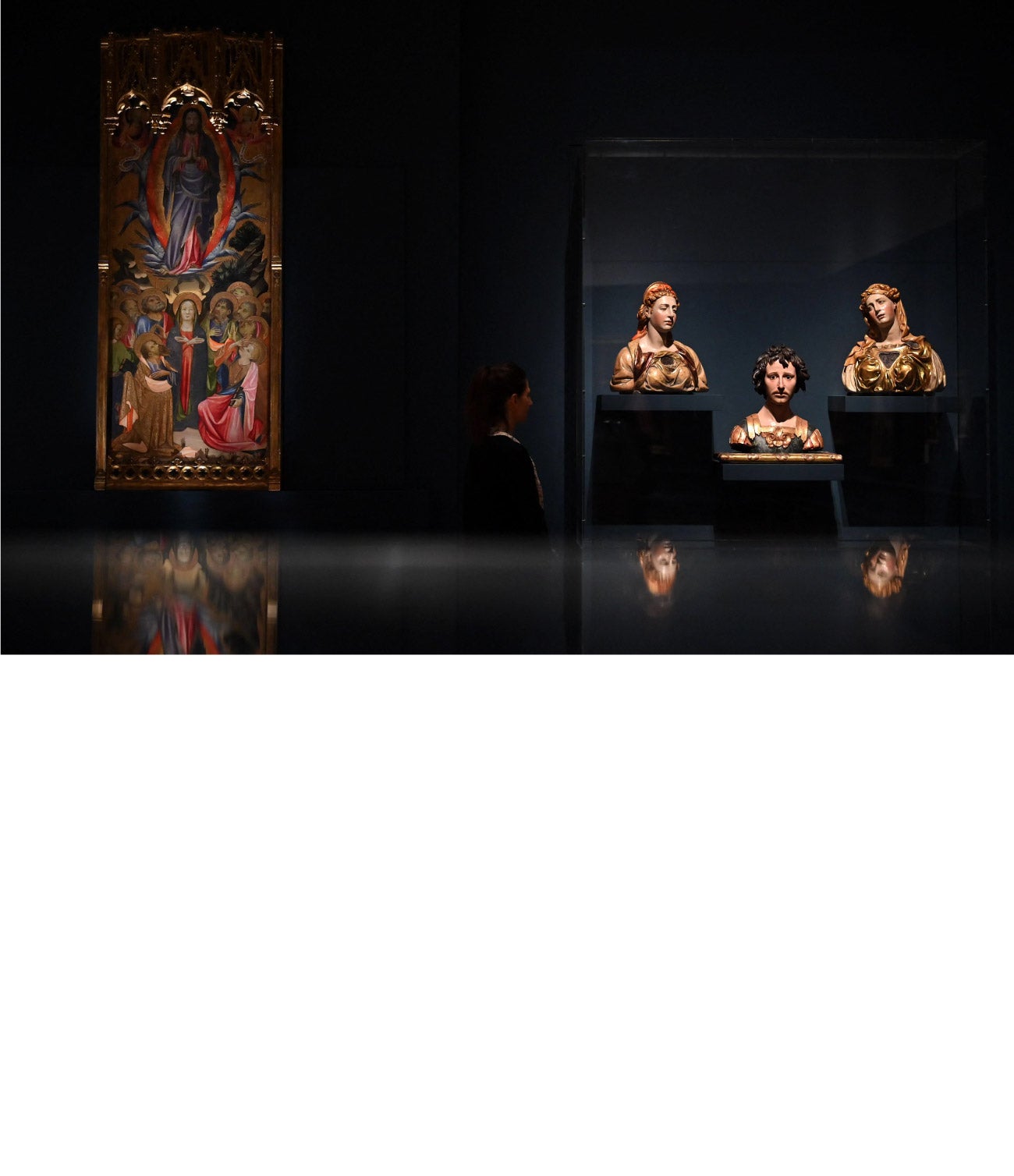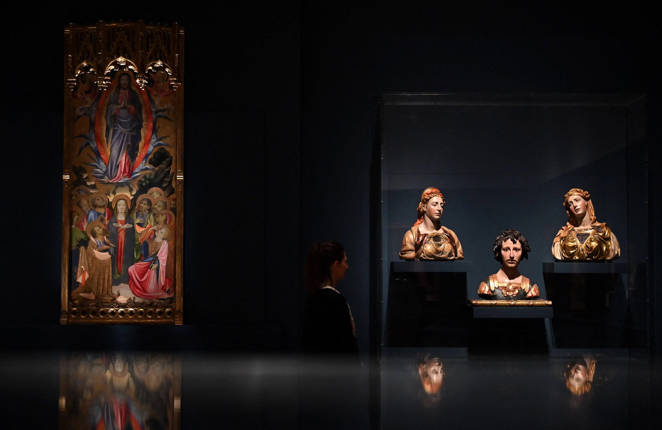 El arte religioso medieval tiene presencia en la exposición con obras que fueron encargadas por la iglesia católica para sus recintos sagrados. En la imagen se aprecian un panel central del retablo