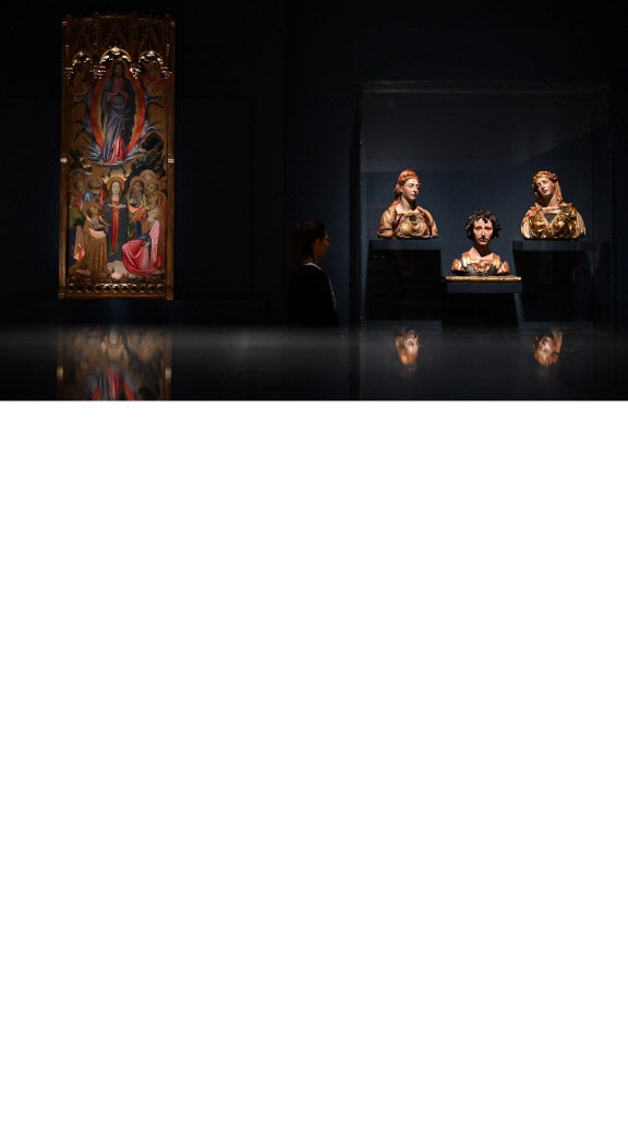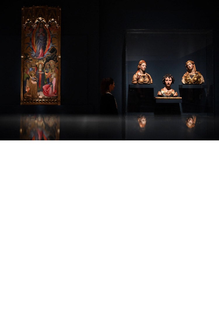 El arte religioso medieval tiene presencia en la exposición con obras que fueron encargadas por la iglesia católica para sus recintos sagrados. En la imagen se aprecian un panel central del retablo 'La ascensión de Cristo', de Miguel Alcañiz, que estuvo en la iglesia de San Juan del Hospital en Valencia, y tres bustos: 'Santa Marta’ y ‘Santa María Magdalena’ de Juan de Juni, y 'San Acisclo' de Pedro de Mena.