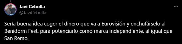 Esta propuesta, planteada por el propio público, ya se abrió al debate el pasado mes de mayo en la red social, cuando los usuarios estallaron ante los resultados de la última edición celebra en Basilea. «Sería buena idea coger el dinero que va a Eurovisión y enchufárselo al Benidorm Fest, para potenciarlo como marca independiente, al igual que San Remo».