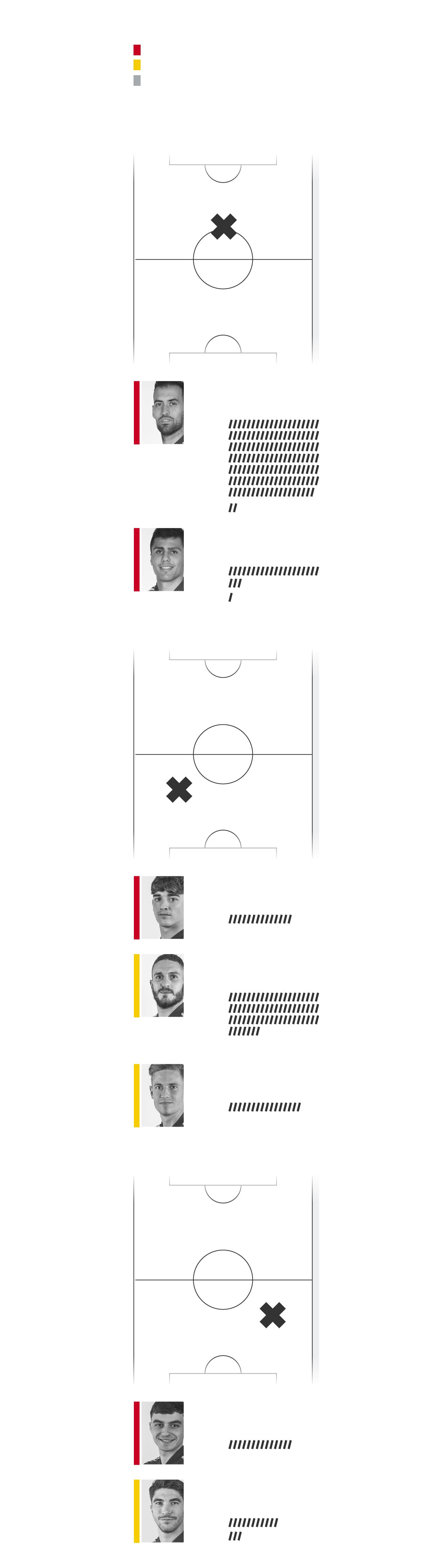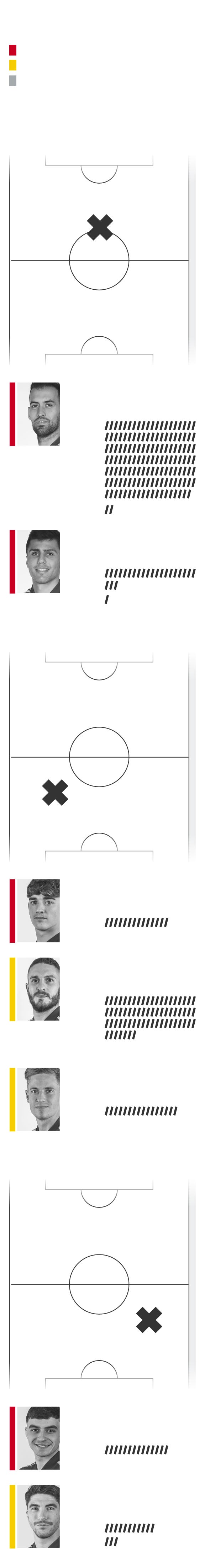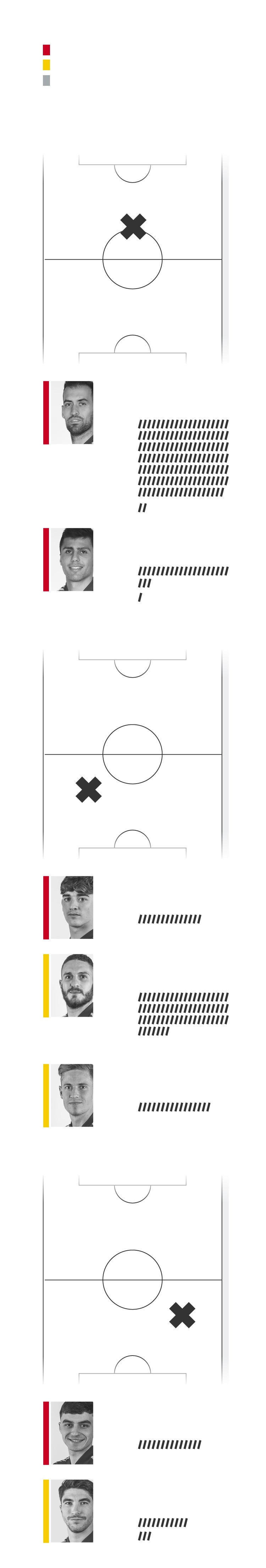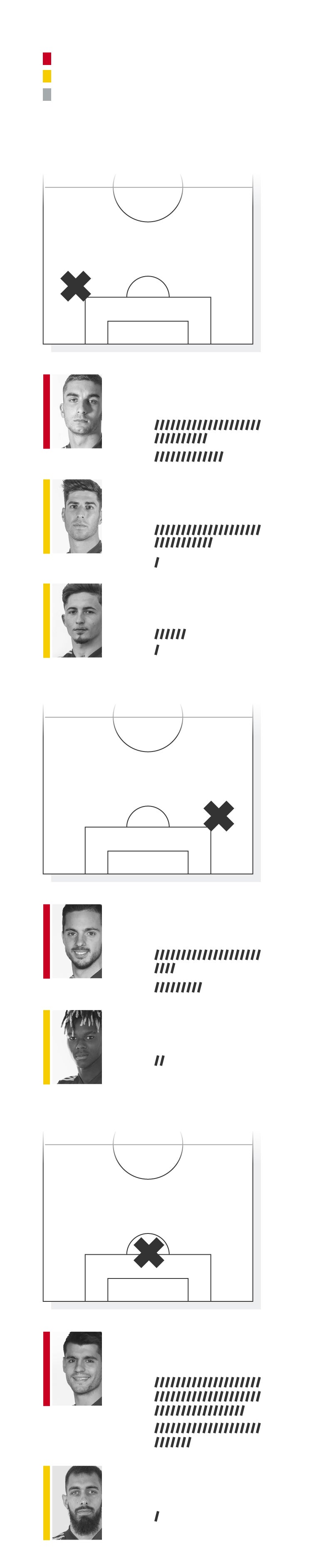 Carlos Soler, Koke y el versátil Marcos Llorente completan ahora mismo la posición. Los dos primeros fueron titulares como pareja de interiores ante Portugal en Braga, donde garantizaron la posesión de balón pero fueron incapaces de aportar verticalidad y meterle una marcha más al partido. El tercero es valorado por Luis Enrique cómo un auténtico comodín.