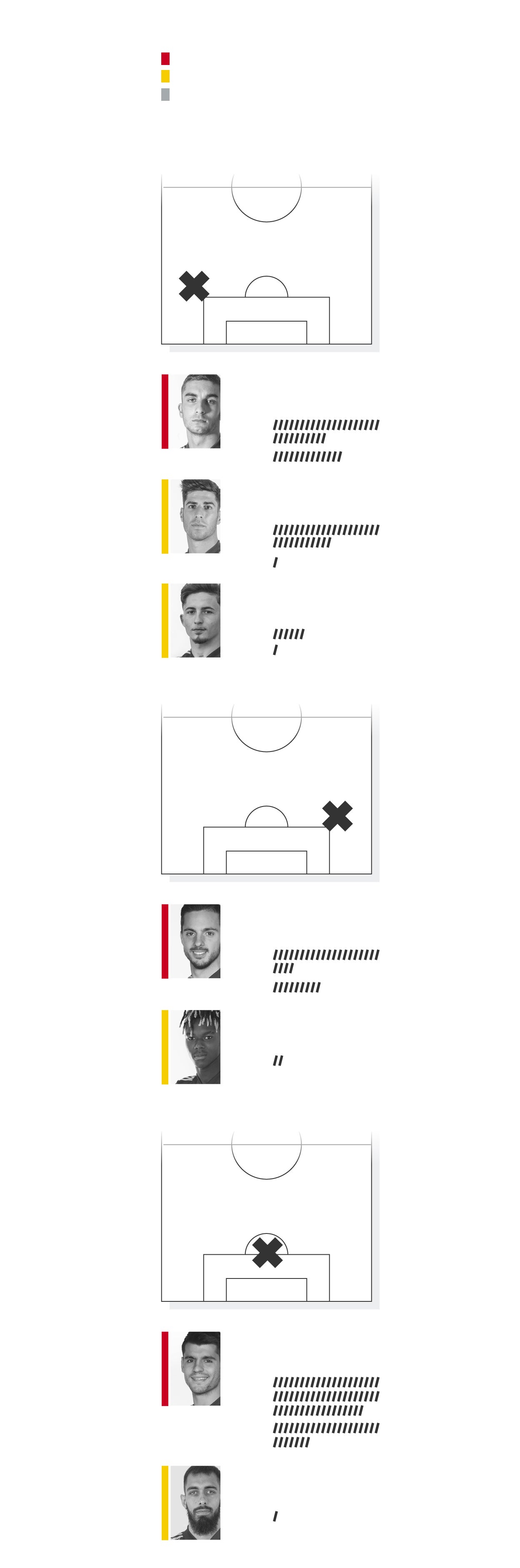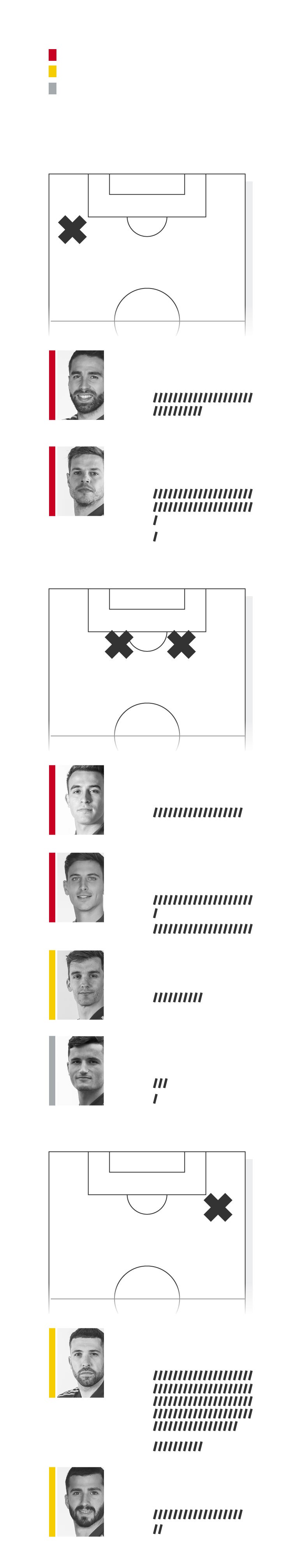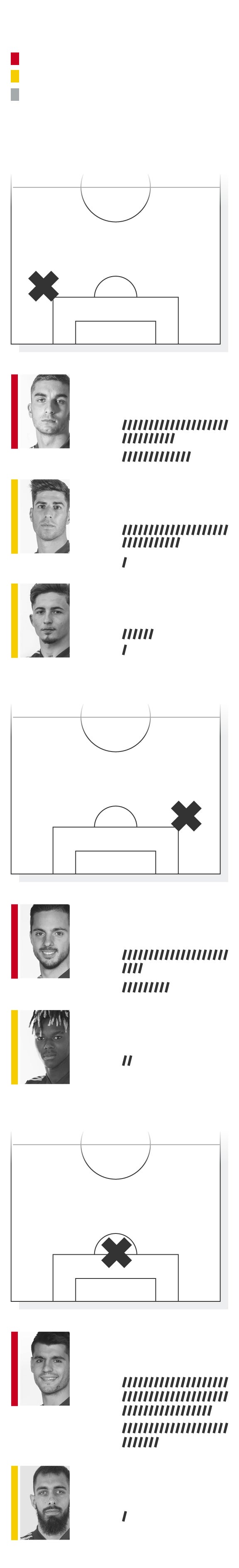 Carlos Soler, Koke y el versátil Marcos Llorente completan ahora mismo la posición. Los dos primeros fueron titulares como pareja de interiores ante Portugal en Braga, donde garantizaron la posesión de balón pero fueron incapaces de aportar verticalidad y meterle una marcha más al partido. El tercero es valorado por Luis Enrique cómo un auténtico comodín.
