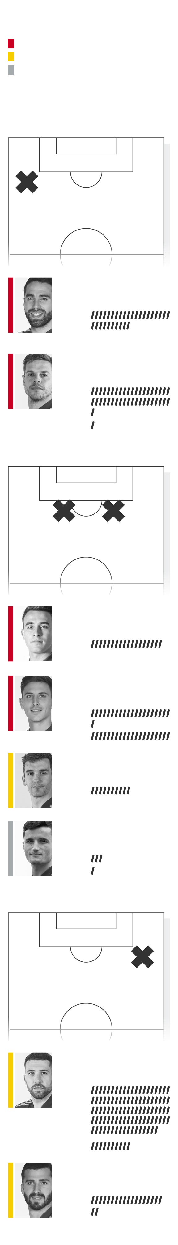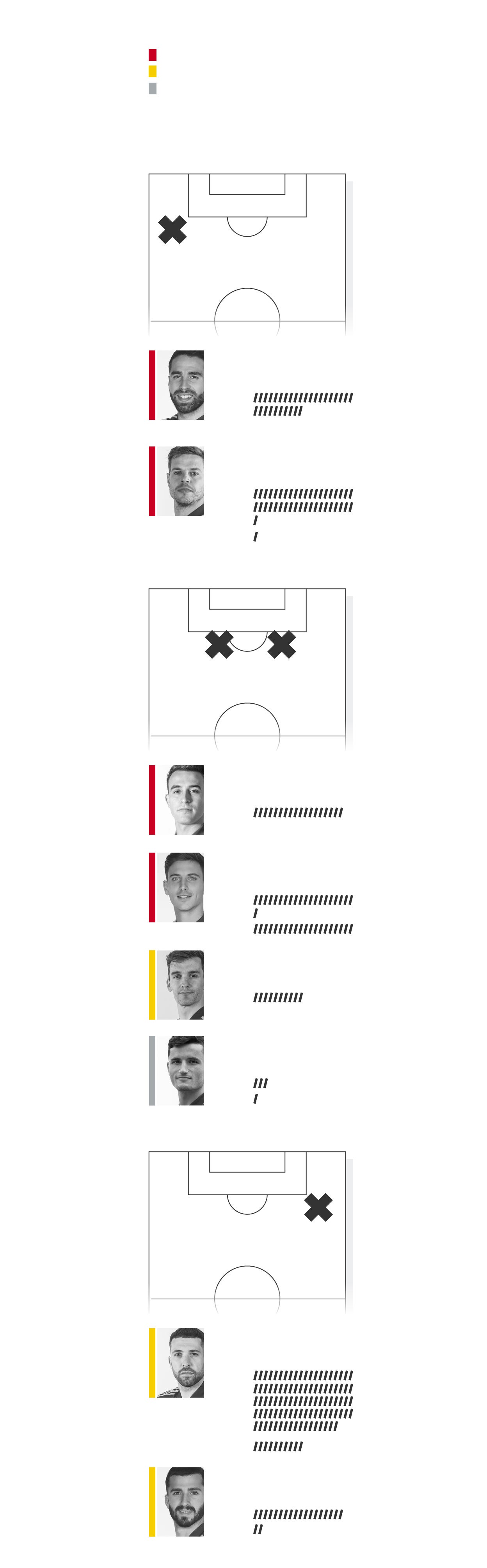En los laterales distintas situación. Por la derecha los experimentados Carvajal y Azpilicueta están consolidados y es difícil que el azulgrana Bellerín acabe superando a alguno de los dos. En el carril zurdo la situación es distinta, ya que Jordi Alba y Gayà tienen mucha competencia y deberán ofrecer la mejor de sus versiones para estar en Catar.