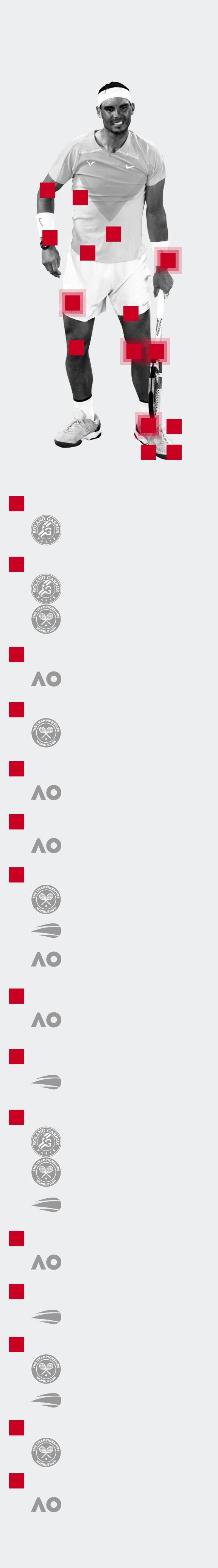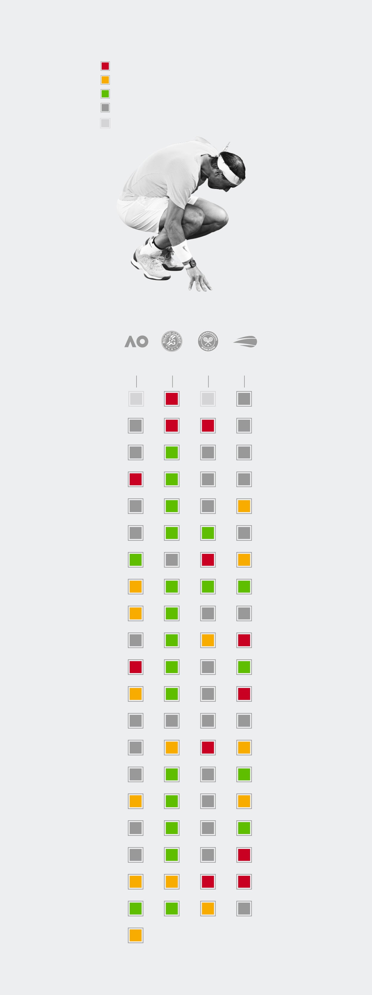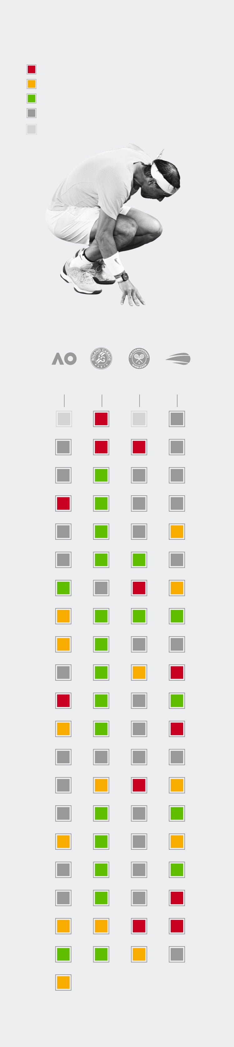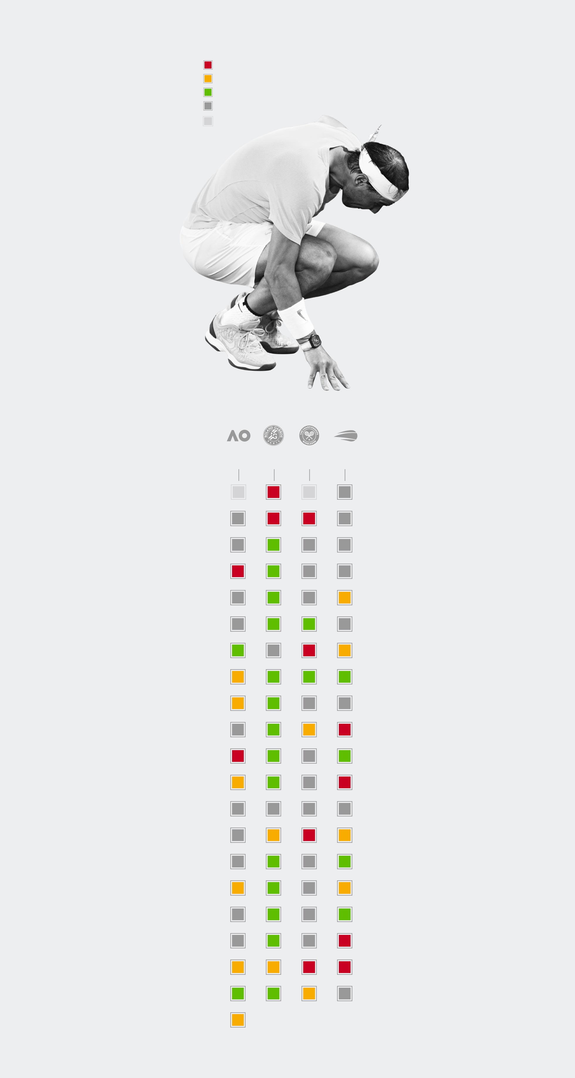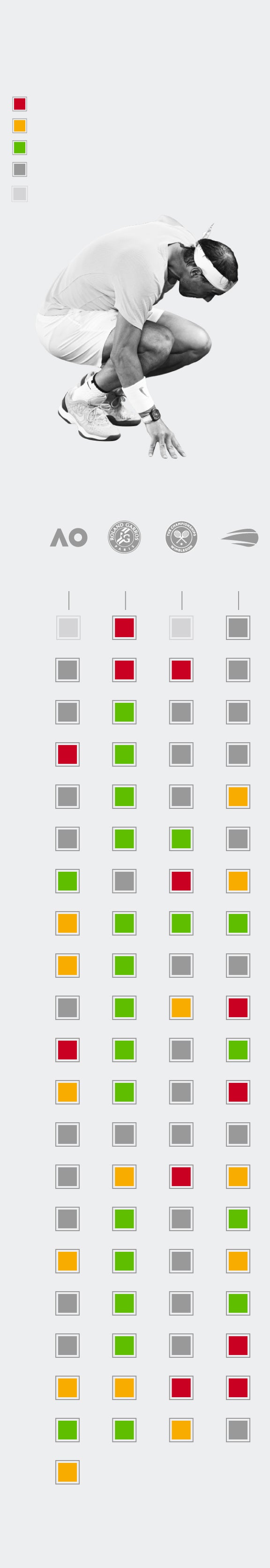 El balance es estremecedor. Nadal suma 23 lesiones, con una media de más de una lesión grave por curso. Incluso siendo el jugador con más Grand Slams de la historia, igualado a 22 con Novak Djokovic, Nadal ha causado baja en doce de ellos, sin contar los próximos Roland Garros, Wimbledon y US Open, en los que tampoco estará, y en otros trece jugó mermado, llegando incluso a retirarse en cuatro de ellos. Comparándolo con su rival por el trono del tenis, el serbio, ha tenido una trayectoria más benévola con las lesiones. Llegó a disputar 51 grandes de forma consecutiva, desde 2005 hasta 2017, algo impensable para el balear.
