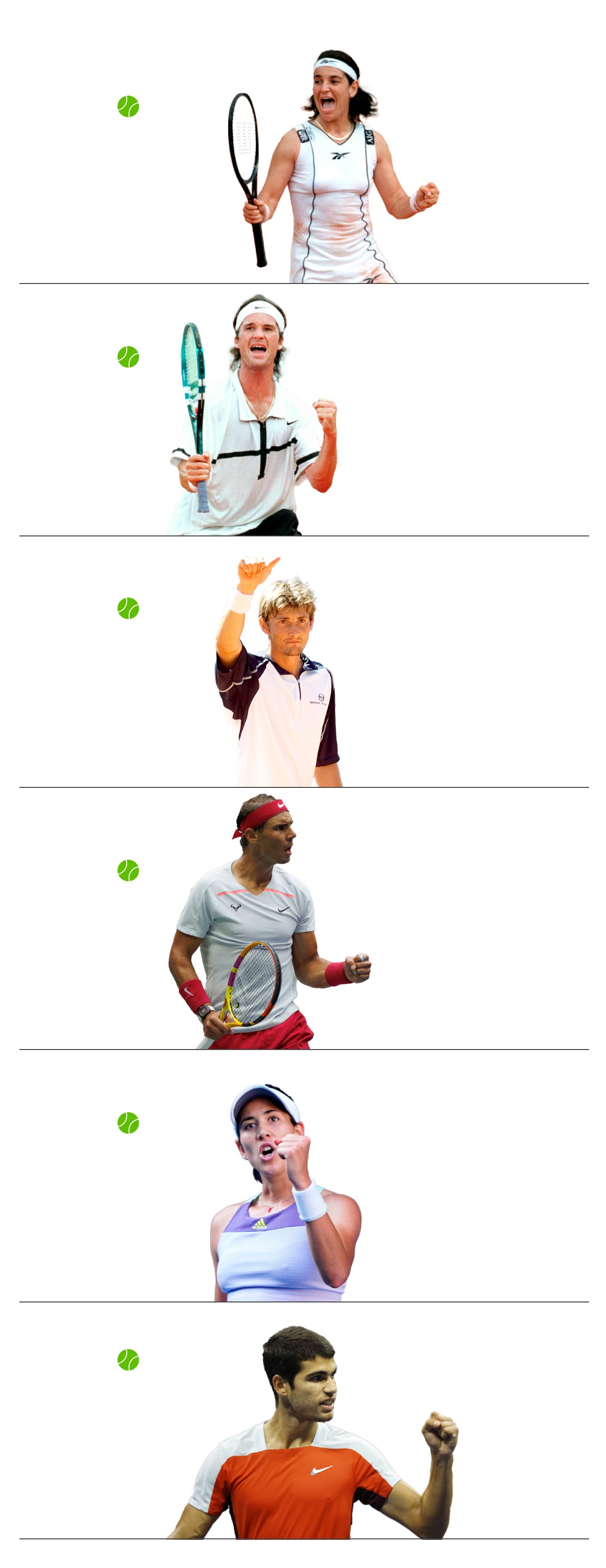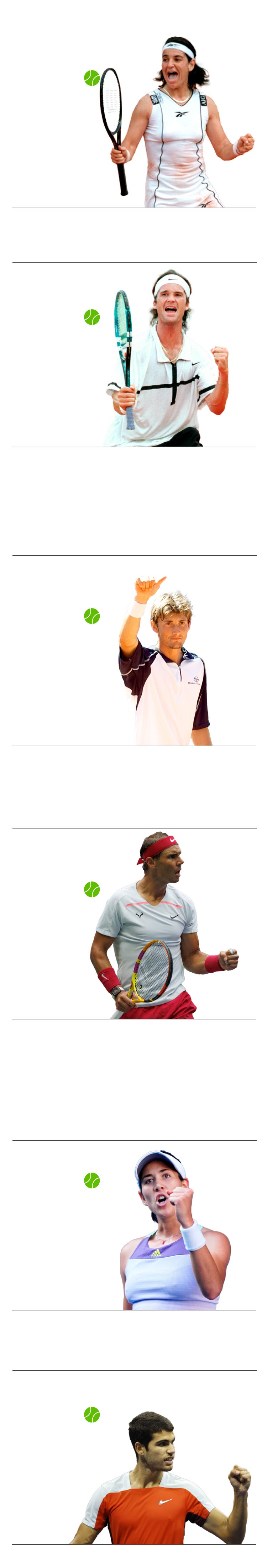 Imagen secundaria 1 - Arriba, Carlos Moyá y Arantxa Sánchez Vicario. Abajo, a la izquierda, Rafa Nadal posa con el trofeo que conquistó en 2018 en Roland Garros. Abajo, a la derecha, Garbiñe Muguruza, tras ganar Wimbledon en 2017.