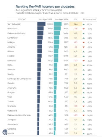 Las olas de calor han afectado al turismo urbano, sobre todo a las ciudades del sur y de la costa mediterránea. Es el caso de Valencia -6,5%, con una caída en la demanda, y de Alicante -1,2% y Málaga -6,2%, entre otras. Al contrario, las ciudades vacacionales del norte de España son la que registran un mayor dinamismo de sus ingresos, favorecidos por las altas temperaturas del resto de España. Destaca el dinamismo de San Sebastián (+13,2%), Santander (+6,2%), Gijón (+10,6%) y La Coruña (+14,6%).