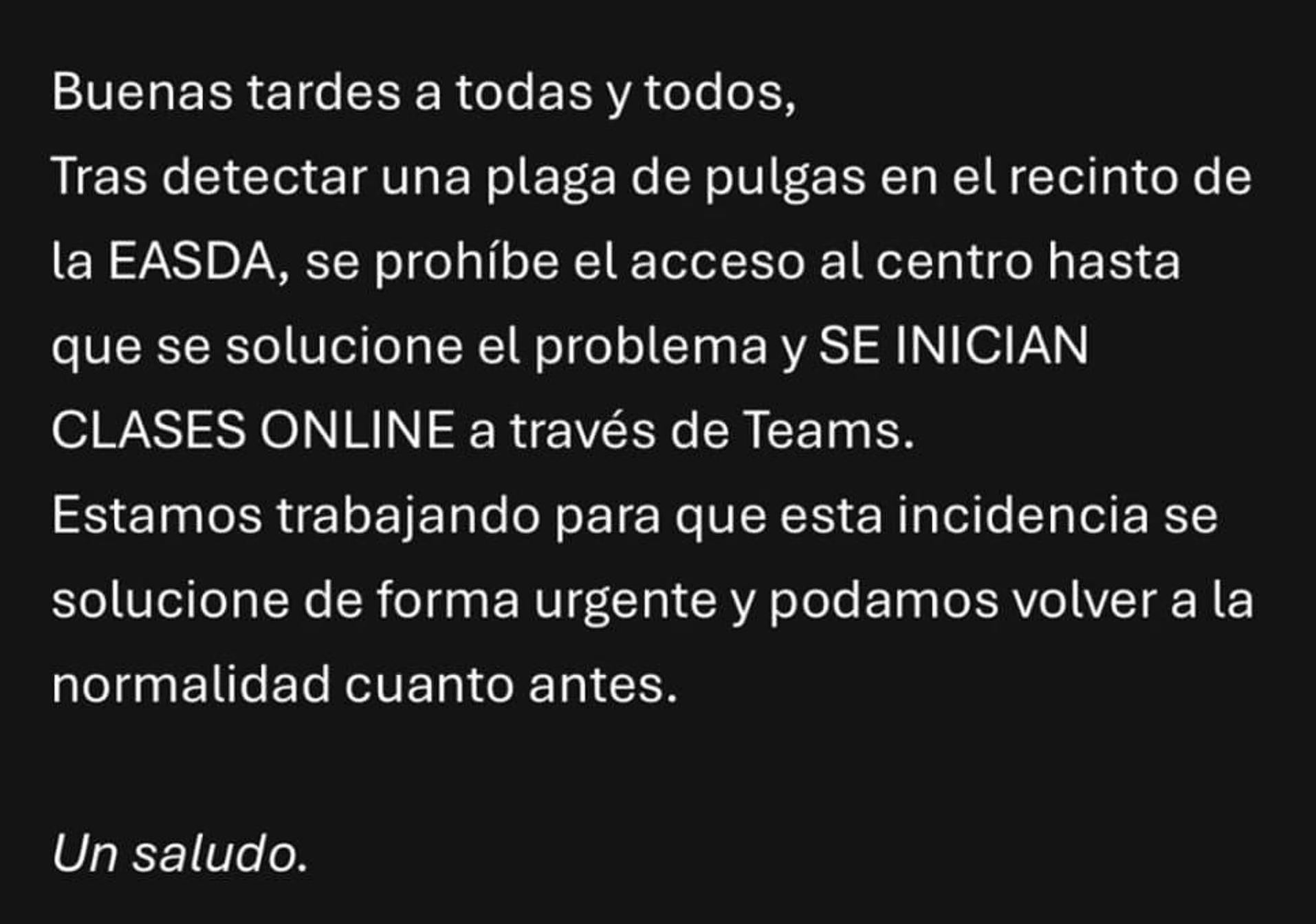 Fuentes del centro señalan que la prioridad es el bienestar de toda la comunidad educativa, y se actúa con la máxima diligencia. De este modo, una vez finalizada la intervención sanitaria, la EASDA reabrirá con normalidad.