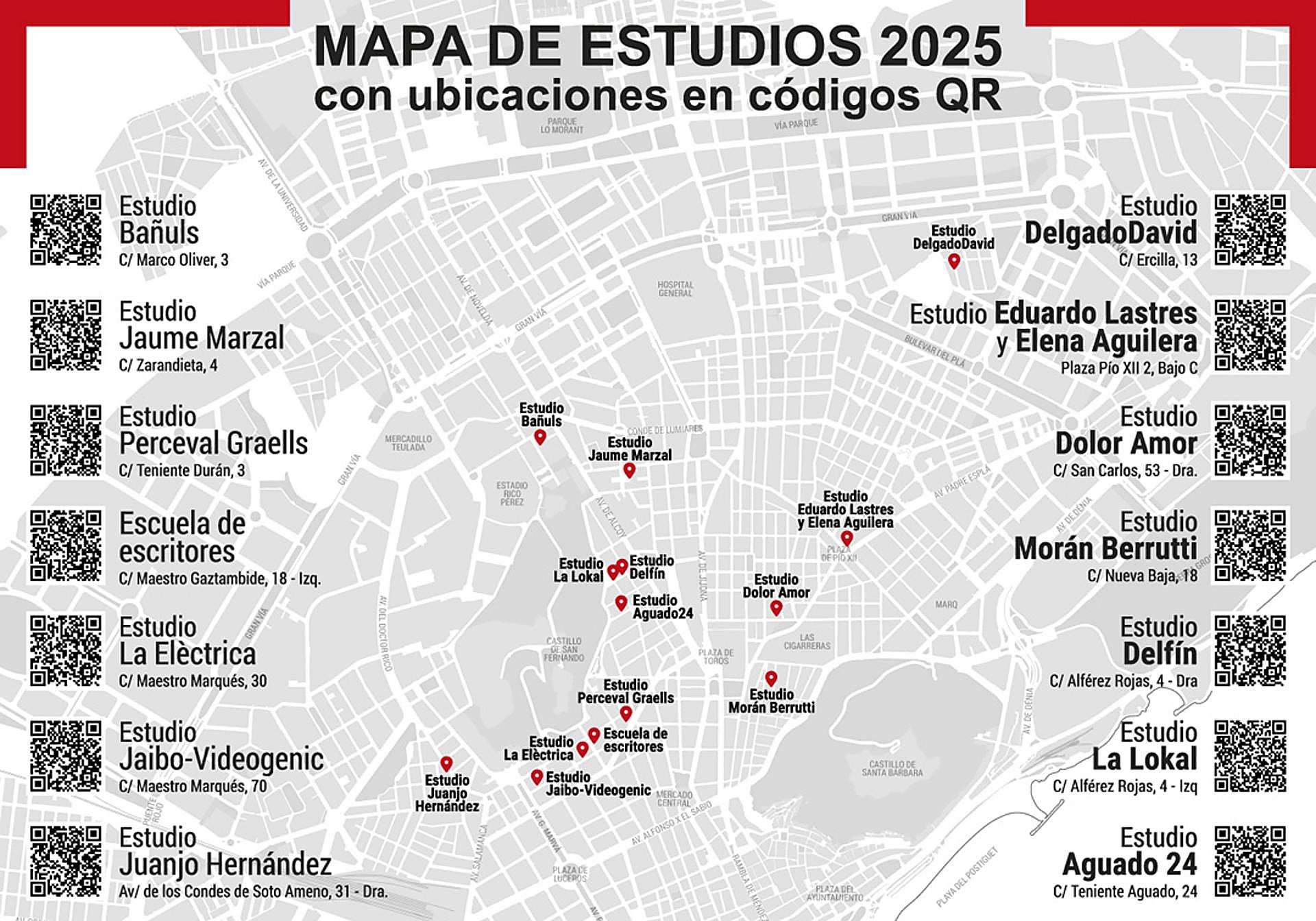 The tour includes iconic studios spread throughout the city such as Bañuls, Eduardo Lastres and Elena Aguilera, Jaume Marzal, Cifo Fango, Dolor Amor, Delgadodavid, or Mariam Cremades, where visitors can enjoy painting, sculpture, installation, photography, sound art, or video.