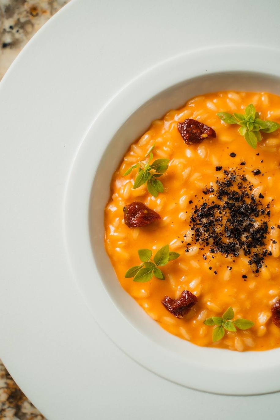 La propuesta gastronómica del chef se centra en torno a tres menús. El primero de ellos es el vegetariano Terra, de 110 euros con platos como verduras rostizadas, gnocchi de espinacas o Risotto contrufa e funghi, entre otros.