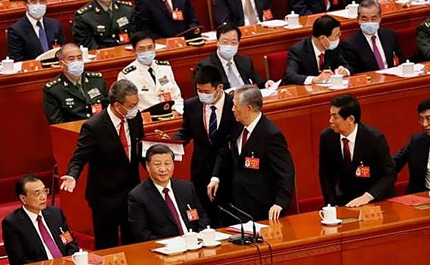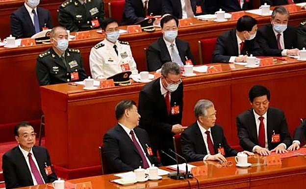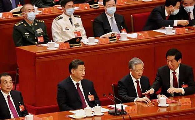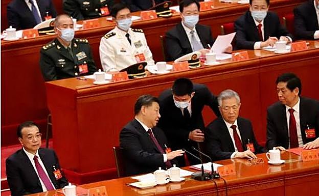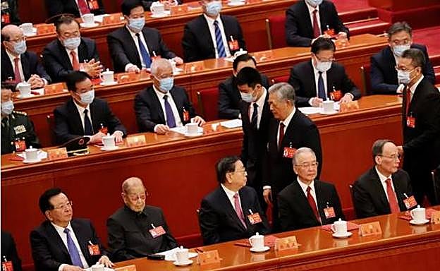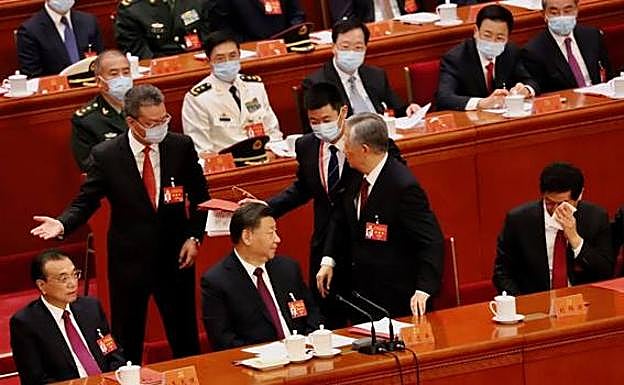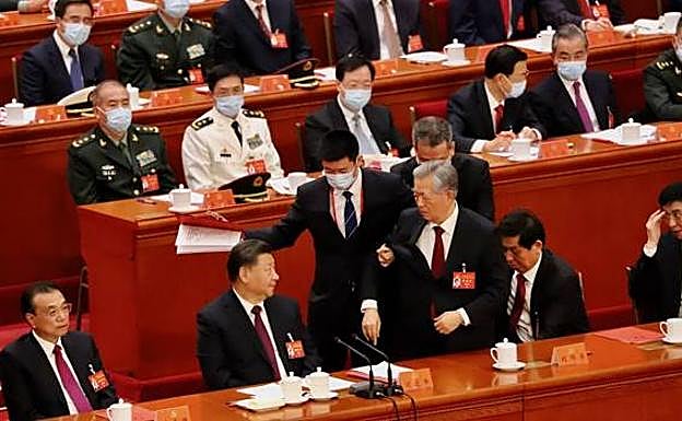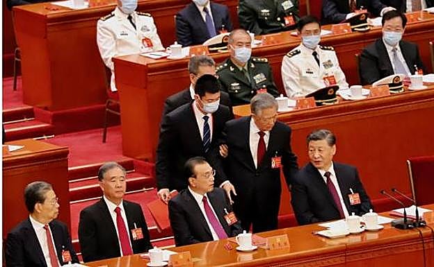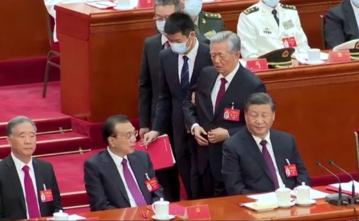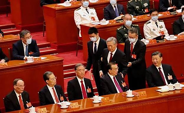 Cabizbajo, Hu Jintao justo por detrás del que fuera su primer ministro, Wen Jiabao, quien ni siquiera lo mira. Salvo Zhang Dejiang, ya retirado, toda la cúpula permanece impasible y con la vista fija al frente. Incluso el veterano Song Ping, quien tiene 105 años y fue el mentor de Hu Jintao. Tal y como se aprecia en la foto, tiene los ojos abiertos y no está sesteando como cuando se leen los discursos. Nadie hace nada y, si es por un motivo de salud, todos se comportan de la manera más fría. Se llevan al expresidente Hu Jintao.