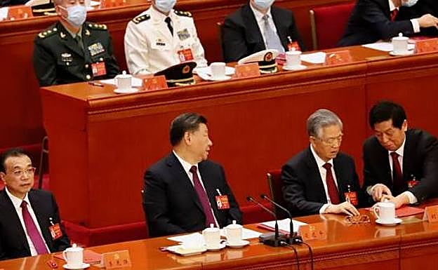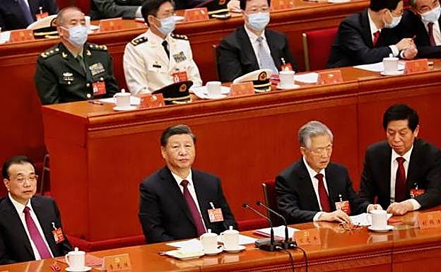 Al pasar a su lado, Hu Jintao posa su mano sobre el hombre del primer ministro, Li Keqiang, quien pertenece como él a la facción de la Liga de las Juventudes Comunistas y era su favorito para sucederle como presidente hace diez años. Pero Xi Jinping quedó por delante y, desde entonces, ha purgado a los más estrechos colaboradores de Hu. Xi contempla la escena con una media sonrisa.