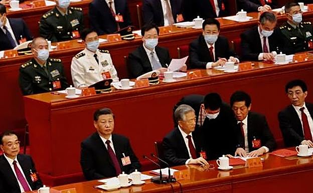 Hu Jintao intenta volver a ver los documentos, que están dentro de una carpeta roja. A su izquierda, el número tres del régimen y presidente de la Asamblea Nacional Popular, Li Zhanshu, se lo impide mientras Xi Jinping observa la situación. Debido a la avanzada edad de Hu, 79 años, y su deteriorado estado de salud, Li Zhanshu lleva atendiéndolo toda la sesión.