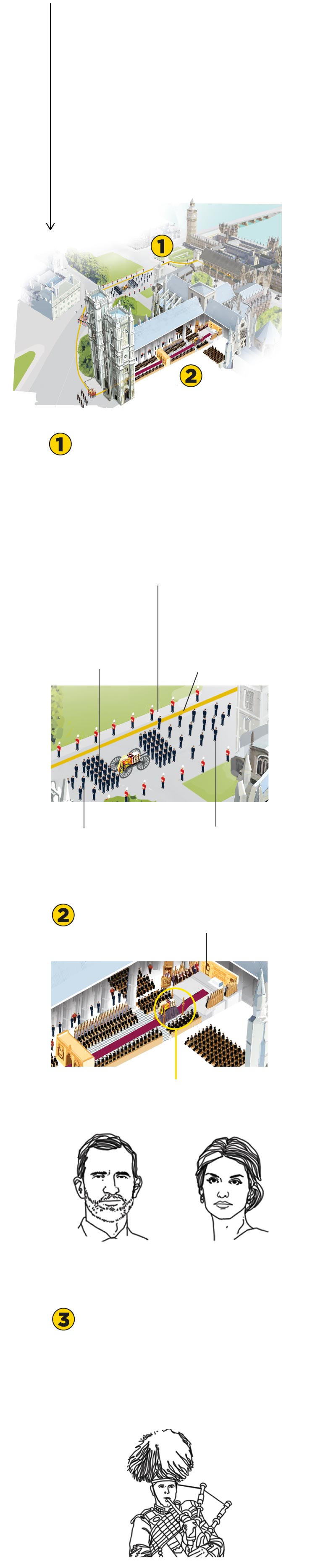 Se espera la presencia de más de 2.200 invitados, entre los que destacan 500 jefes de estado y dignatarios. Los asistentes comenzarán a entrar a la abadía a las nueve de la mañana. Los jefes de estado se reunirán previamente en el Royal Hospital, en el barrio de Chelsea, desde donde irán juntos. El presidente de Estados Unidos y su mujer serán de los pocos que no acceden en el transporte comunitario.