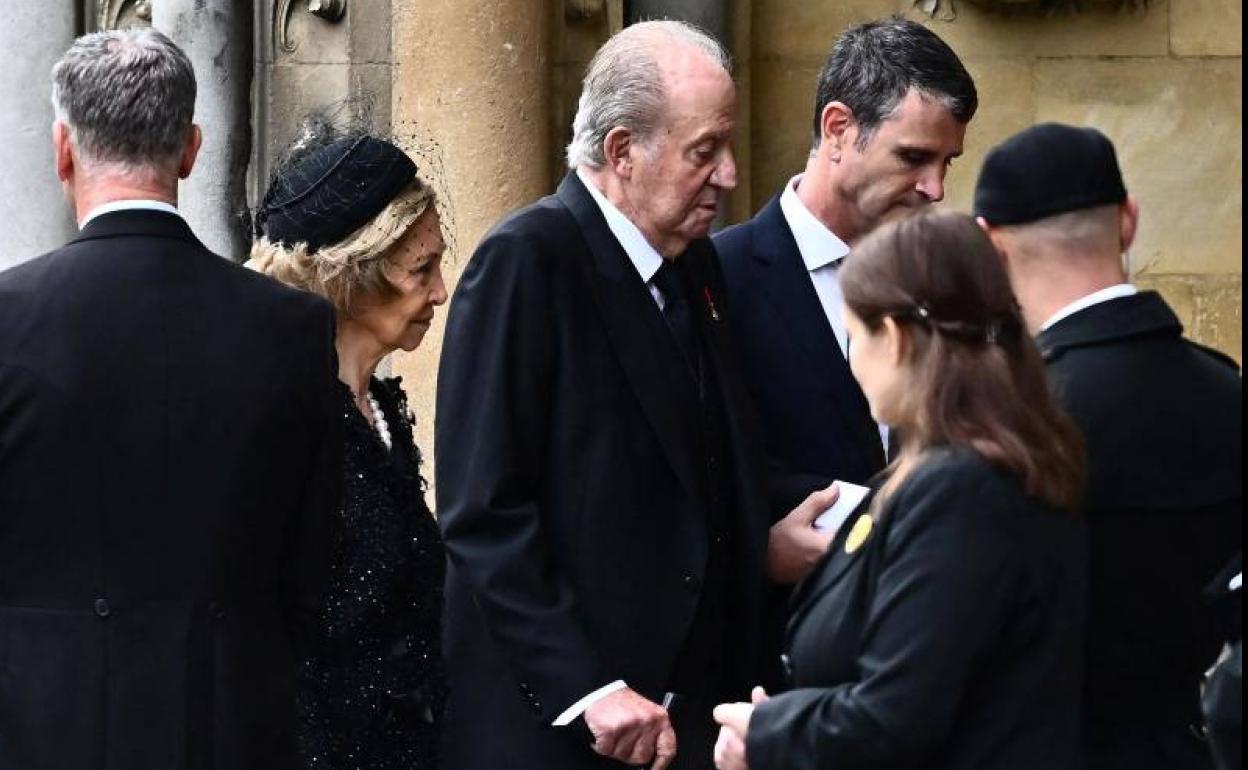 El rey Juan Carlos y la reina Sofía, llegan junto a los reyes de Holanda a la abadía de Westminster para asistir al funeral de Estado por Isabel II. reuters