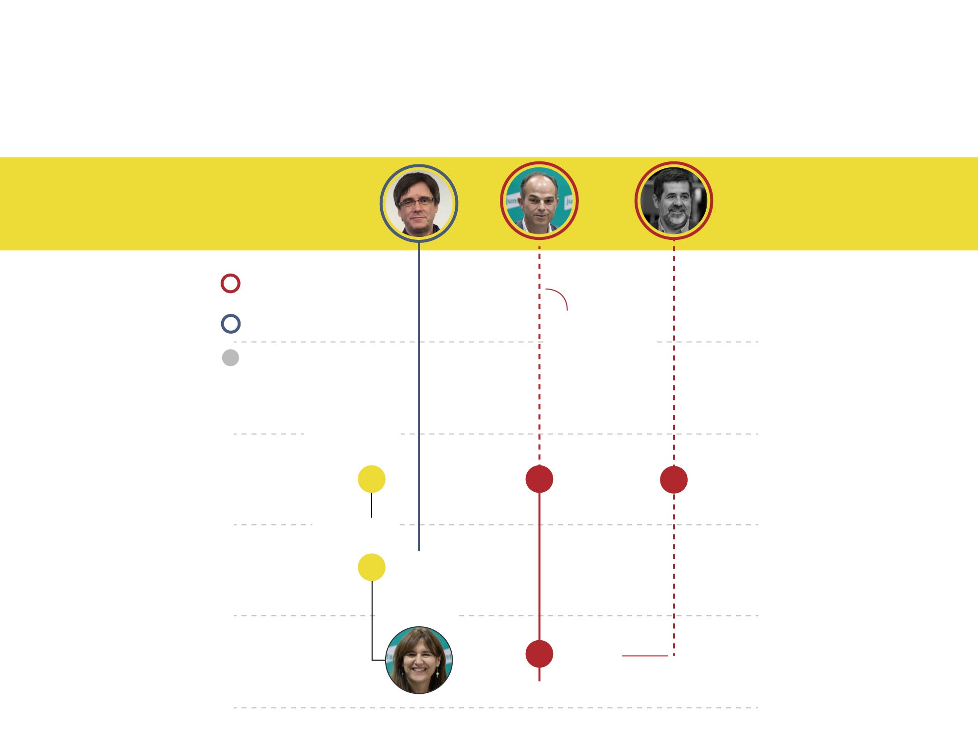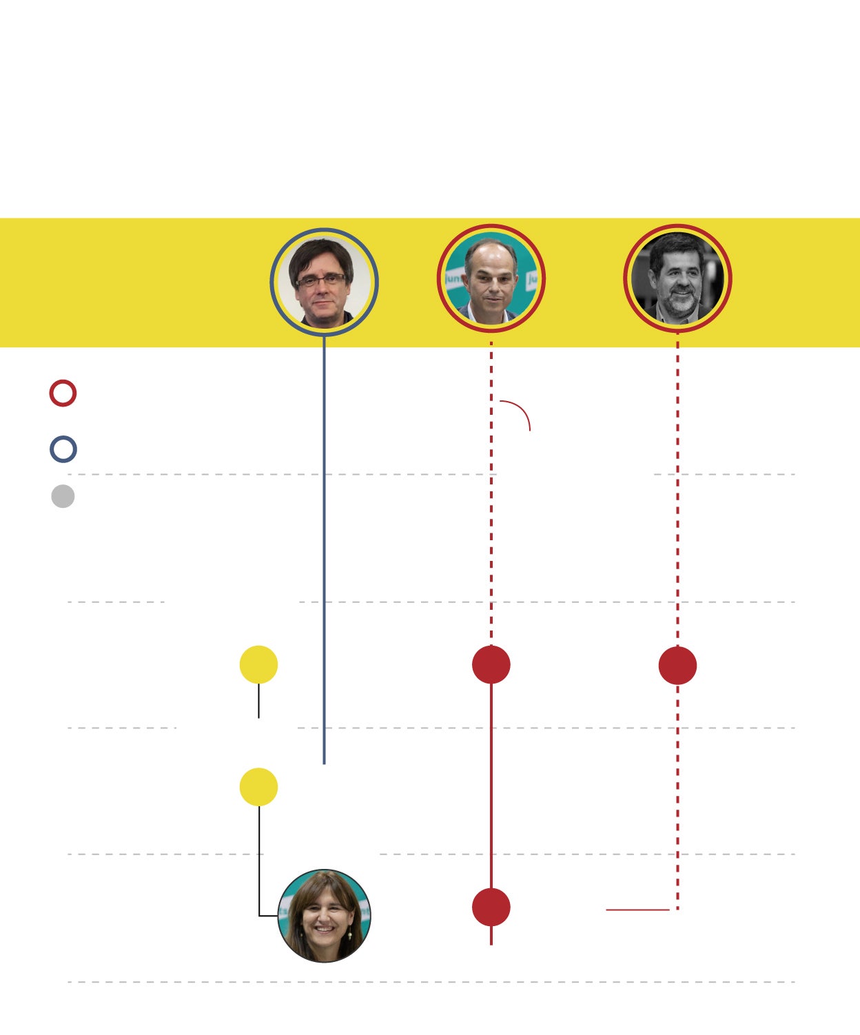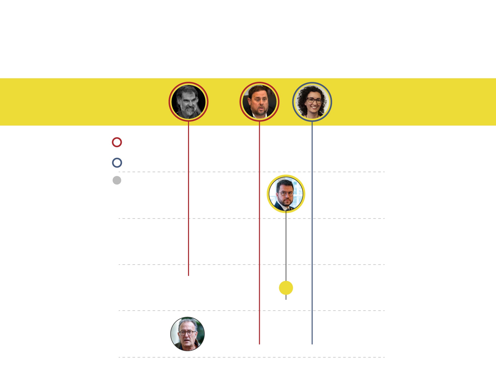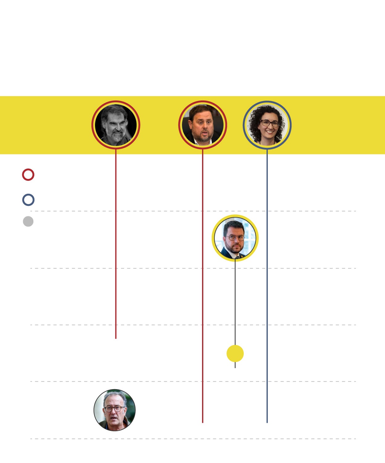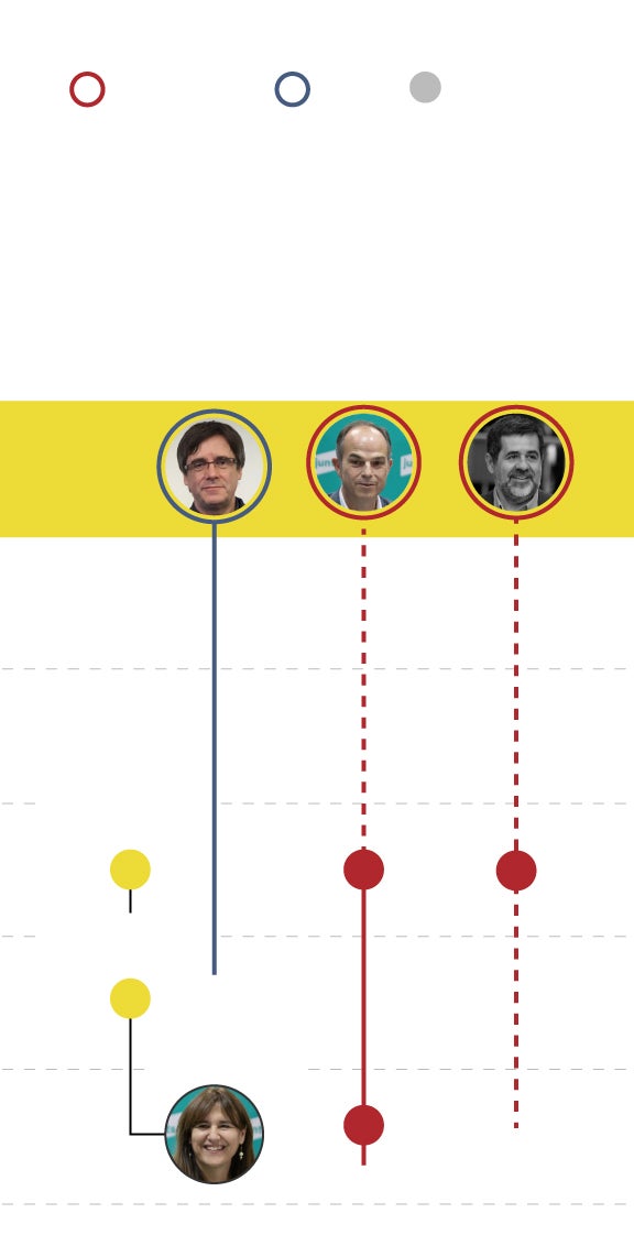 El panorama político en Cataluña y en el conjunto de España ha dado un vuelco de 180 grados desde octubre de 2017 hasta ahora. Caras nuevas y nuevos liderazgos en Barcelona y en Madrid, en el Gobierno y en el Govern, un lustro después. Algunos de los líderes del 'procés', no obstante, se mantienen al frente. Es el caso de Oriol Junqueras y Marta Rovira, que siguen como presidente de ERC y secretaria general, respectivamente, y Jordi Turull, consejero de la Presidencia en la Generalitat hace cinco años y hoy máximo ejecutivo de Junts. Carles Puigdemont ya no tiene responsabilidades de partido, pero sigue siendo el referente en los postconvergentes. De los líderes de ámbito nacional, solo Pedro Sánchez aguanta cinco años después.