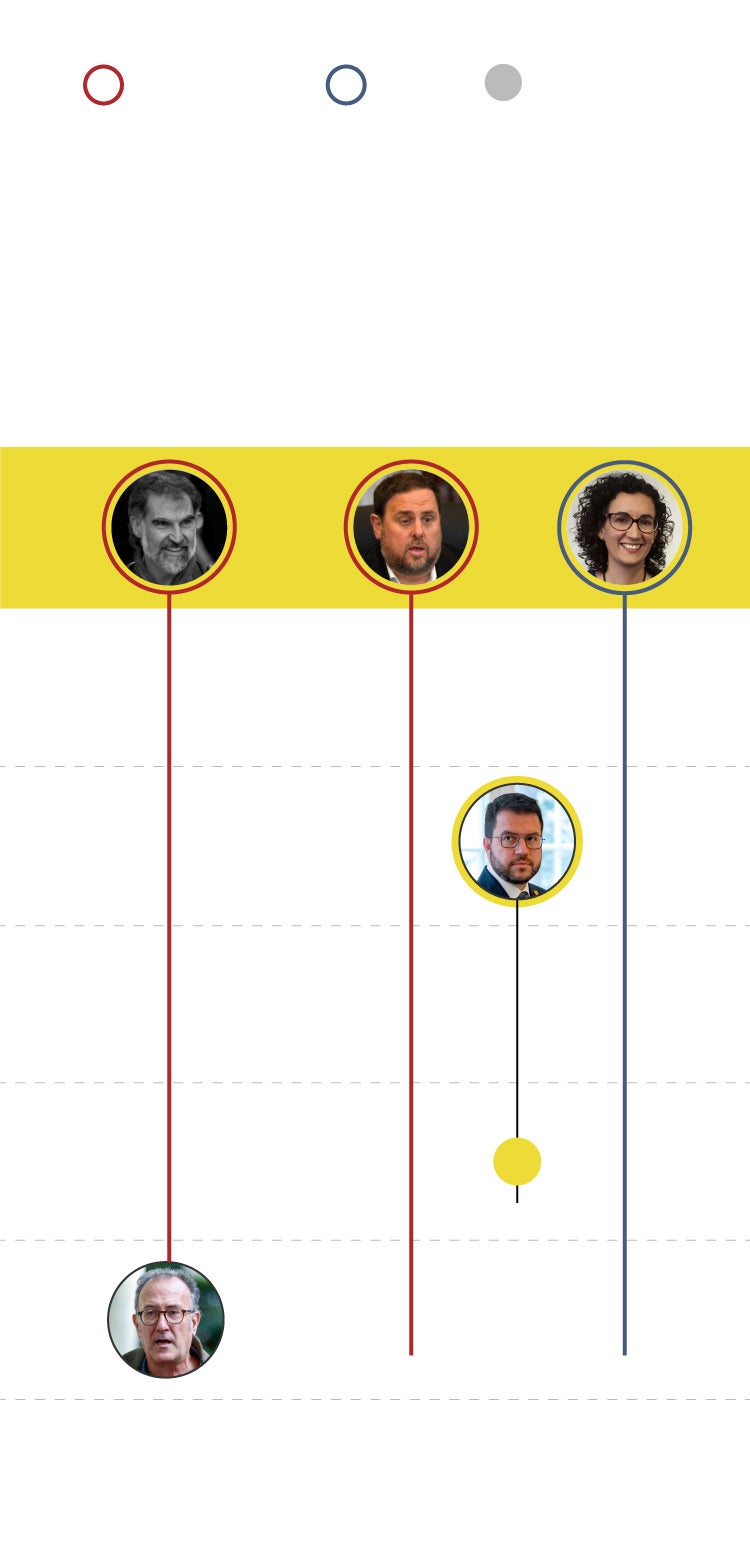 El presidente de Òmnium Cultural, Xavier Antich, llamó recientemente a abrir un nuevo ciclo en el independentismo, tras el fin del 'procés', y afirmó que este nuevo periodo debería pilotarlo una nueva generación de políticos. Antich sustituyó a Jordi Cuixart, condenado por sedición por el 20-S y por el 1-O y uno de los principales dirigentes del independentismo. Se ha apartado por completo. En cambio, en ERC no tienen intención de cambiar de líderes como pide Òmnium.