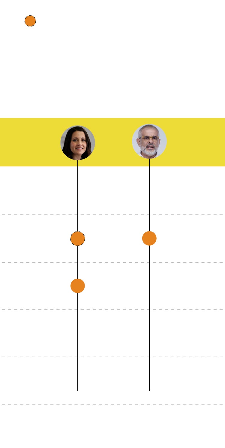 A pesar de ser la primera fuerza, no pudo gobernar y pasó a liderar de nuevo la oposición. En las generales de 2019 se presentó como candidata por Barcelona y dio el salto a la política nacional de la mano de Albert Rivera, que lideraba la formación naranja en octubre de 2017 y que un lustro después está alejado de la política. Arrimadas encabeza en estos momentos Ciudadanos a nivel nacional y en Cataluña lo hace Carlos Carrizosa, mano derecha de la líder hace cinco años. Eso sí, lidera un grupo parlamentario de solo seis diputados.