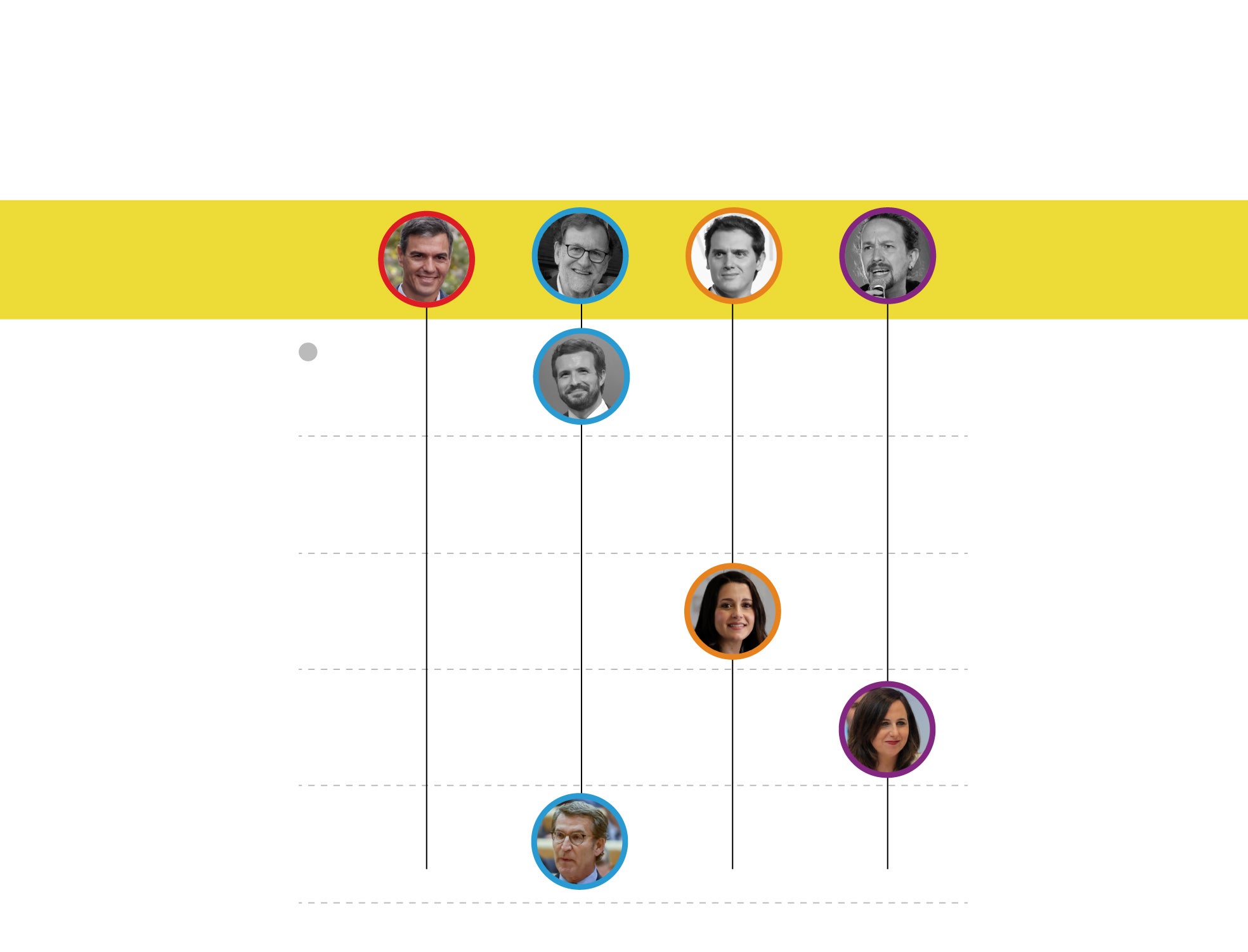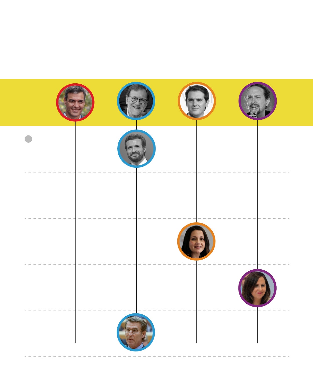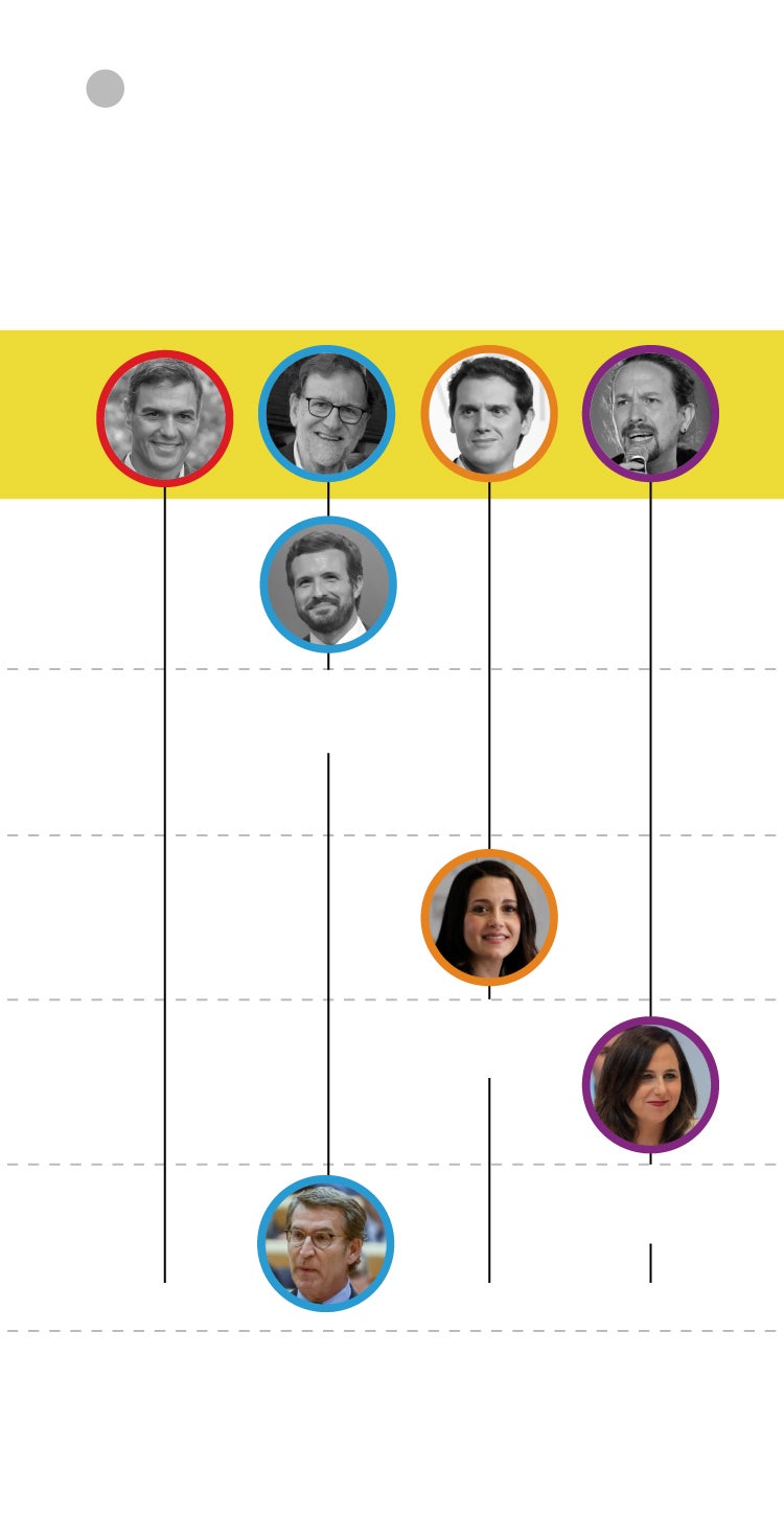 El actual presidente del Gobierno y secretario general del PSOE era líder de los socialistas durante el 1-O y jefe de la oposición. El presidente del Gobierno y del PP era Mariano Rajoy, hoy alejado de la política. Quienes estaban junto a él, al mando, también se han apartado. Es el caso de Soraya Sáenz de Santamaría o Dolores de Cospedal. En cinco años, el PP ha pasado de ser la fuerza del Gobierno a comandar la oposición. Desde Rajoy, el partido ha tenido dos presidentes más: Pablo Casado y Alberto Núñez Feijóo. El actual líder del centroderecha era presidente de la Xunta de Galicia en octubre de 2017. Albert Rivera está también fuera de la política. Su lugar lo ocupa Inés Arrimadas. Pablo Iglesias, secretario general de Podemos hace un lustro, está apartado asimismo de la primera línea política. Ya no tiene responsabilidades orgánicas en la formación morada. En su lugar está Ione Belarra, actual ministra de Derechos Sociales y Agenda 2030. Hace un lustro era diputada en el Congreso.