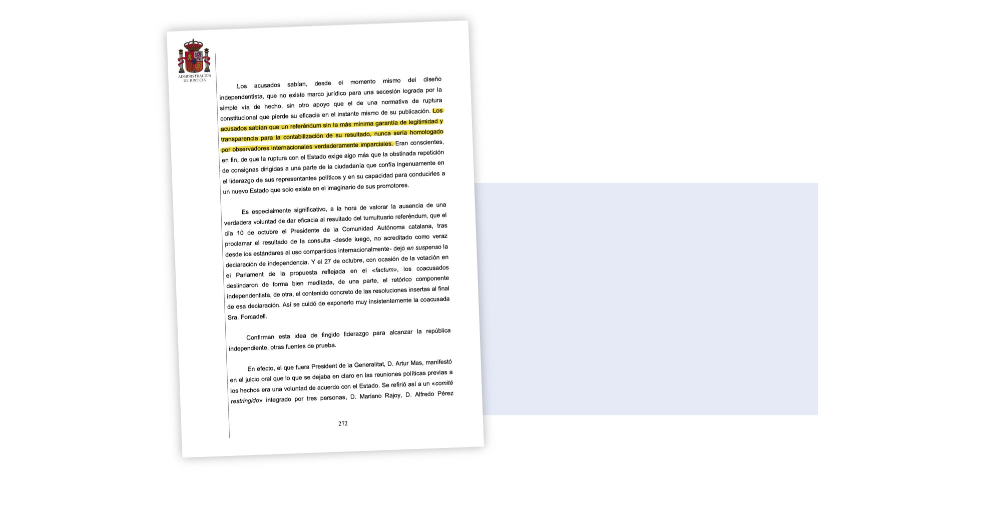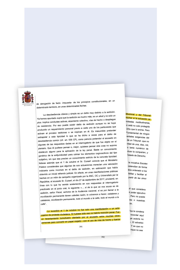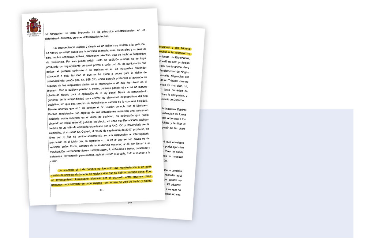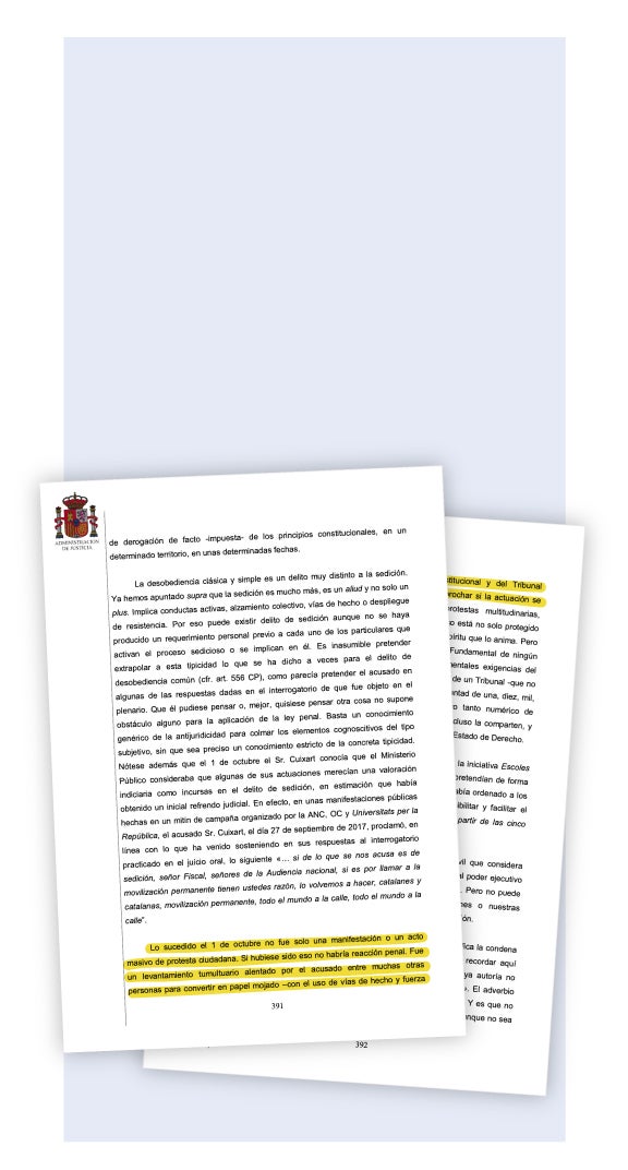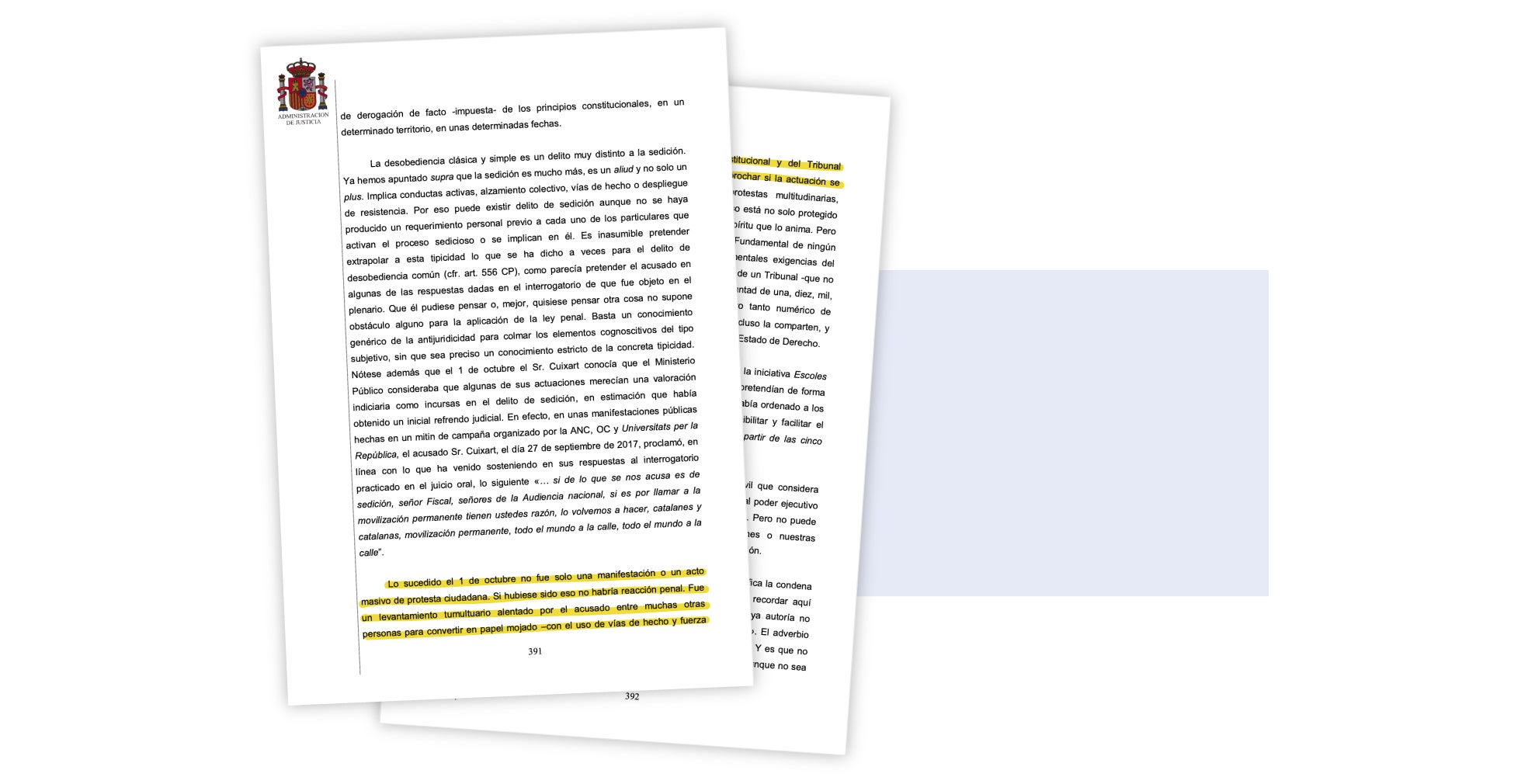 «Lo sucedido el 1 de octubre no fue sólo una manifestación o un acto masivo de protesta ciudadana. Si hubiese sido eso no habría reacción penal», explicó el fallo de la sala segunda del Supremo, donde entre febrero y junio de 2019 se juzgó la denominada Causa Especial 20907/2017. Aquella sentencia insistió en que el 1-O «fue un levantamiento tumultuario alentado por los acusados entre muchas otras personas para convertir en papel mojado -con el uso de vías de hecho y fuerza física- unas decisiones judiciales del Tribunal Constitucional y del Tribunal Superior de Justicia de Cataluña», que había declarado ilegal no solo el referéndum sino todas las leyes de desconexión aprobadas por el Parlament.
