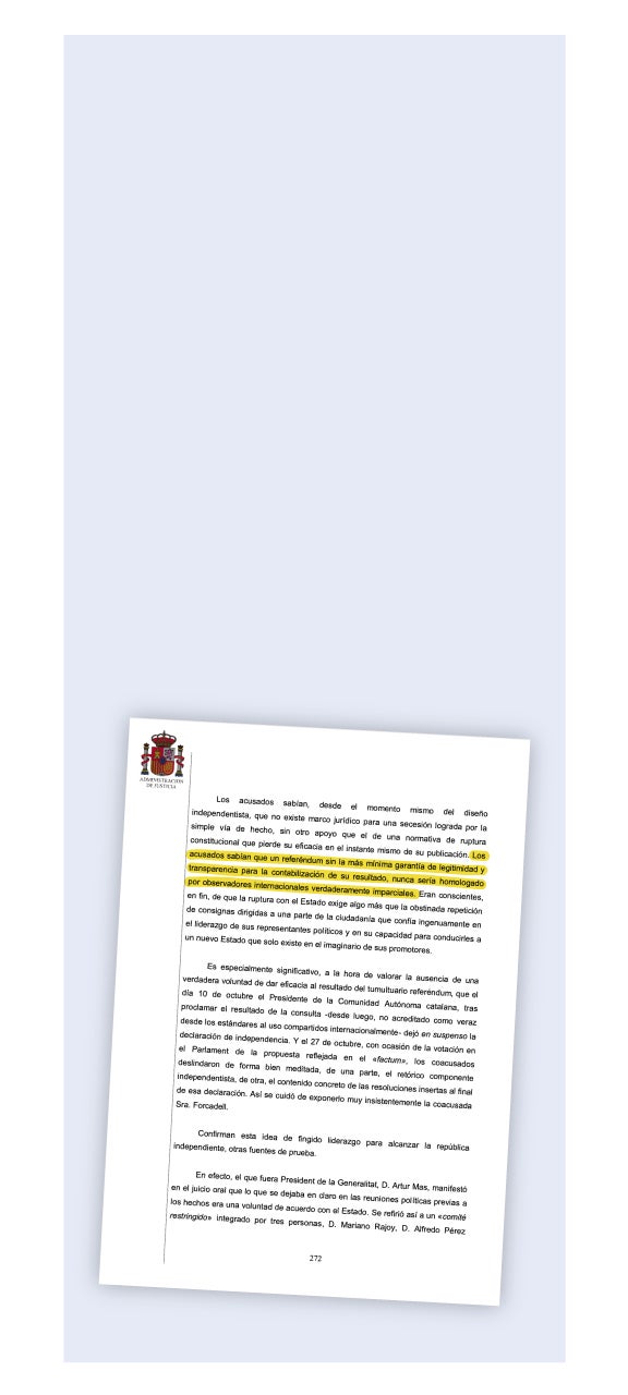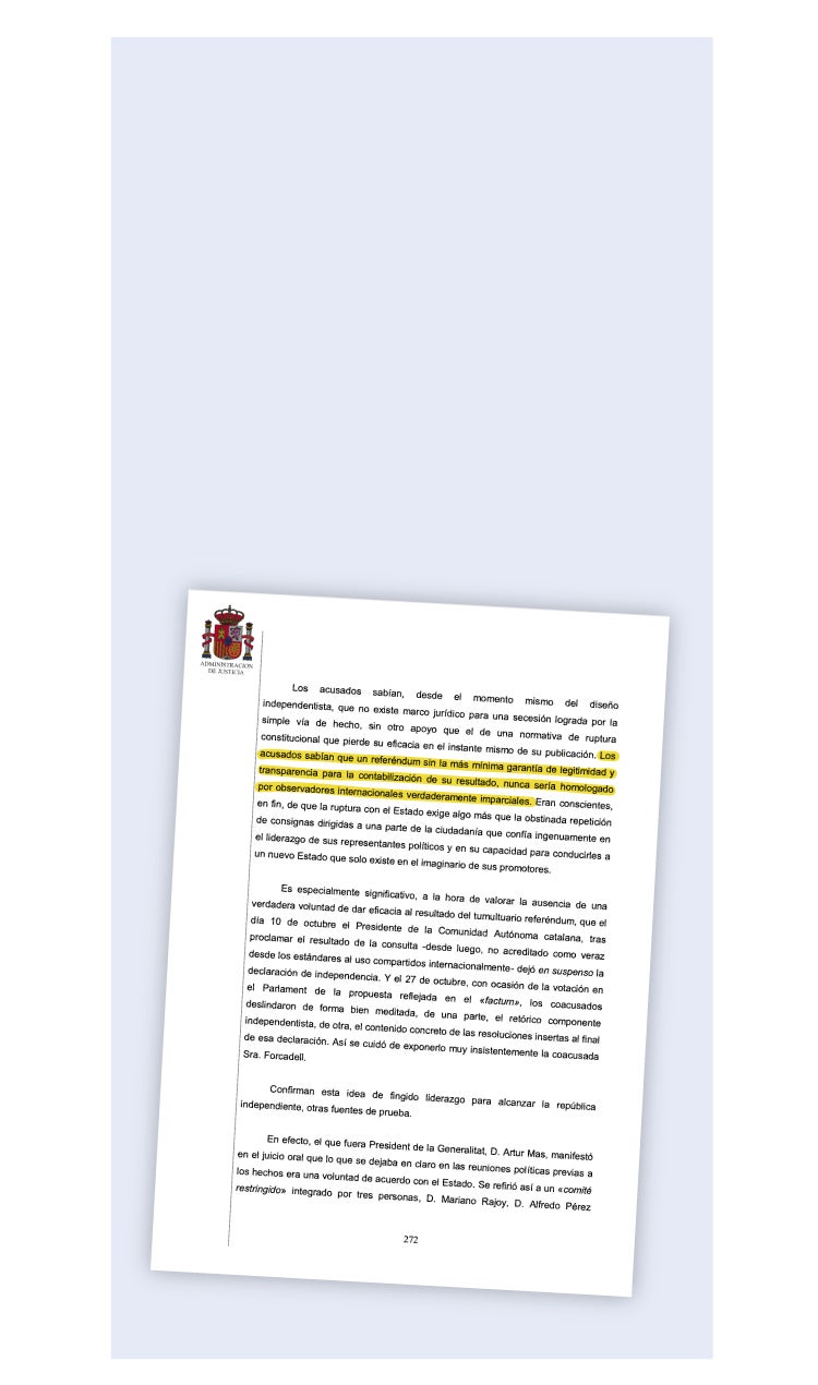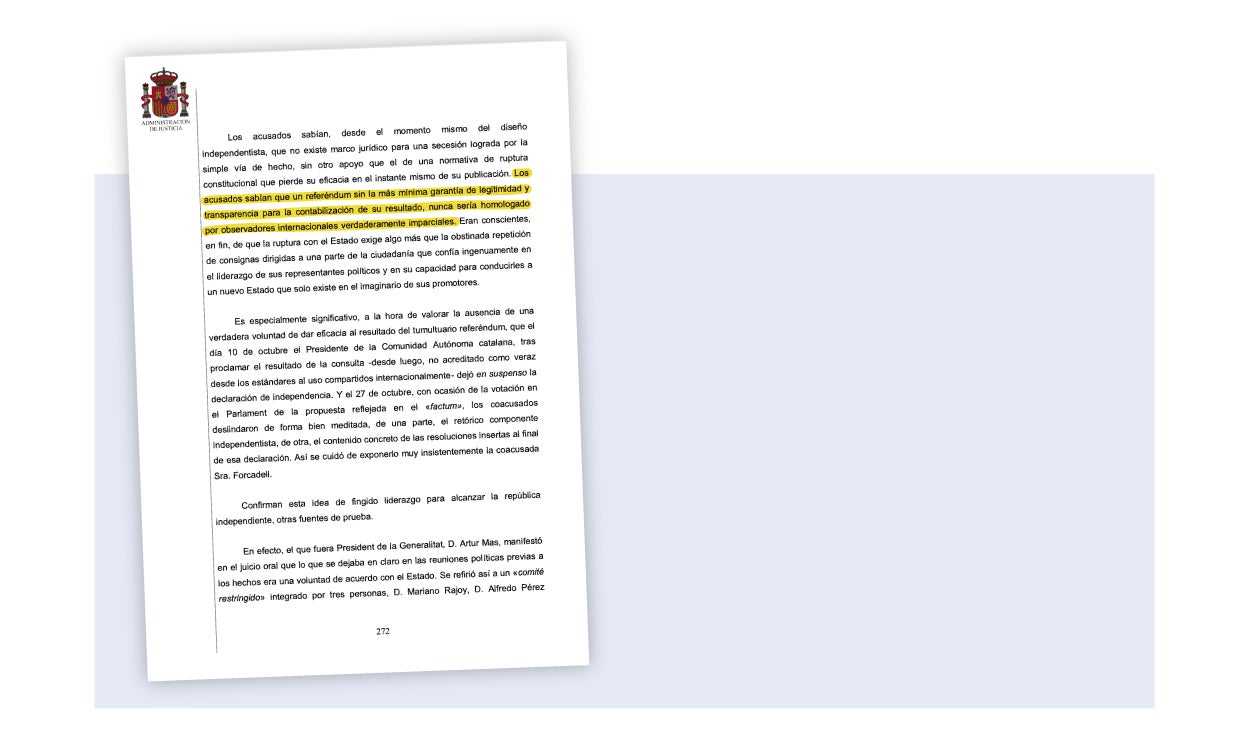 Puigdemont, Junqueras y los suyos –explicó la sentencia- se embarcaron en un peligroso proceso de levantamiento popular a pesar de ser plenamente conscientes de que la consulta de aquel domingo, más allá de constituir un desafío al Estado, no iba a servir para nada. «Los acusados sabían que un referéndum sin la más mínima garantía de legitimidad y transparencia para la contabilización de su resultado, nunca sería homologado por observadores internacionales verdaderamente imparciales», apuntó la resolución de la Sala Segunda.