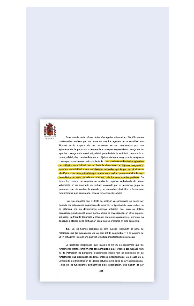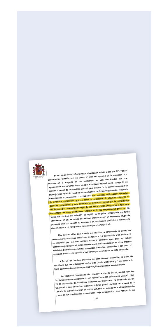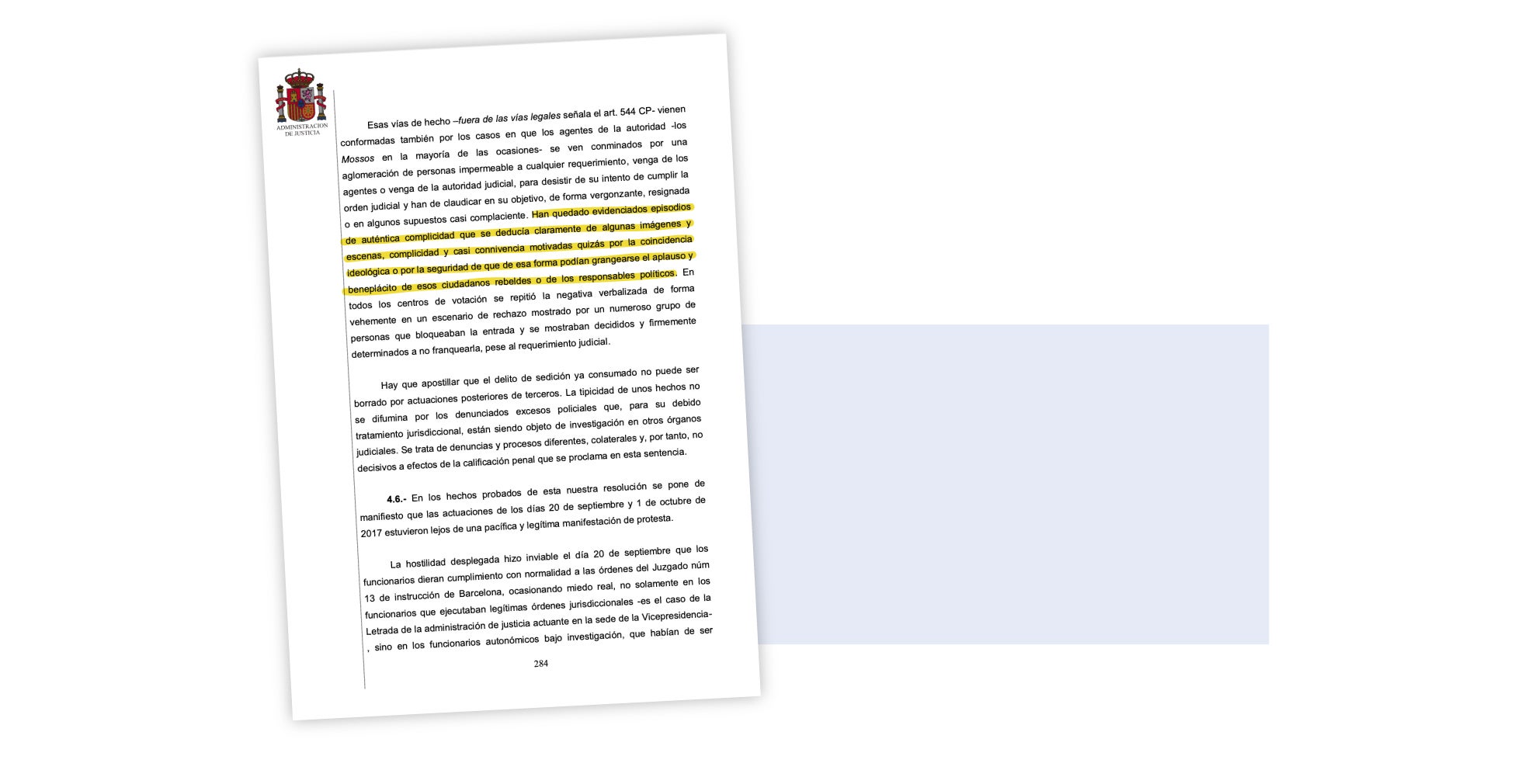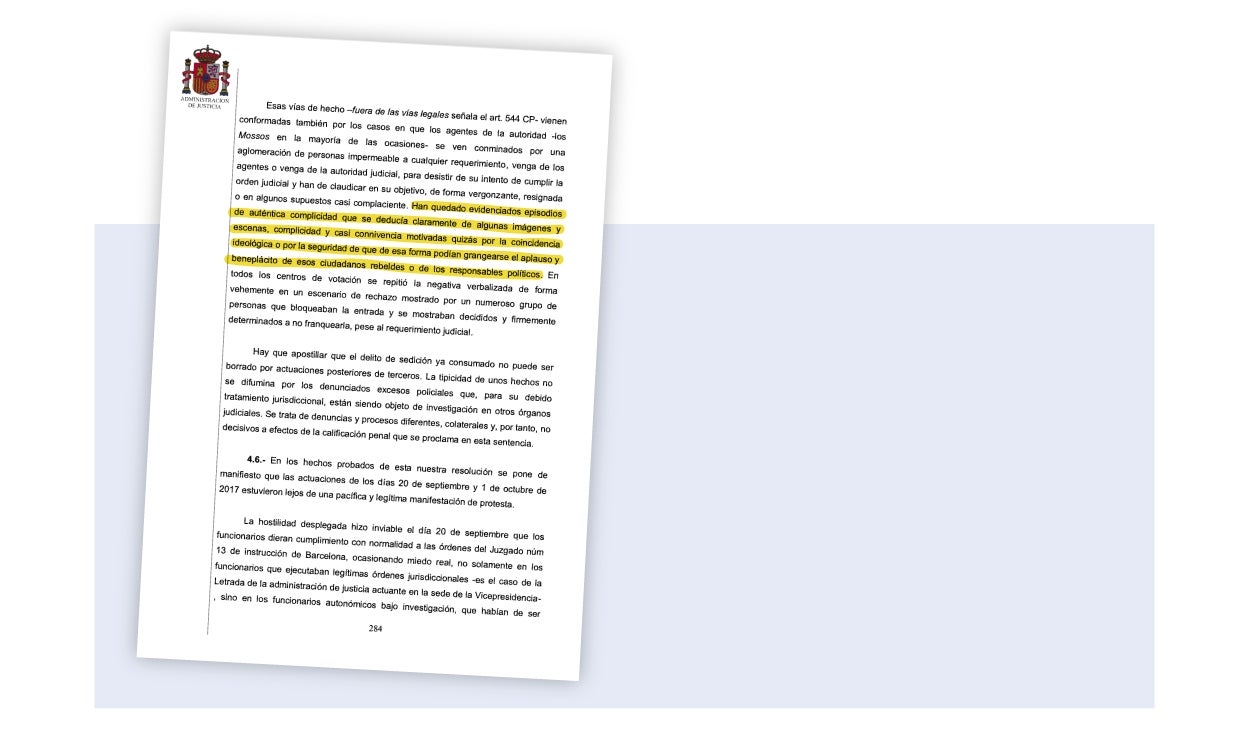 «Han quedado evidenciados episodios de auténtica complicidad (de los Mossos) que se deducía claramente de algunas imágenes y escenas, complicidad y casi connivencia motivadas quizás por la coincidencia ideológica o por la seguridad de que de esa forma podían grangearse el aplauso y beneplácito de esos ciudadanos rebeldes o de los responsables políticos», concluyó el fallo judicial.