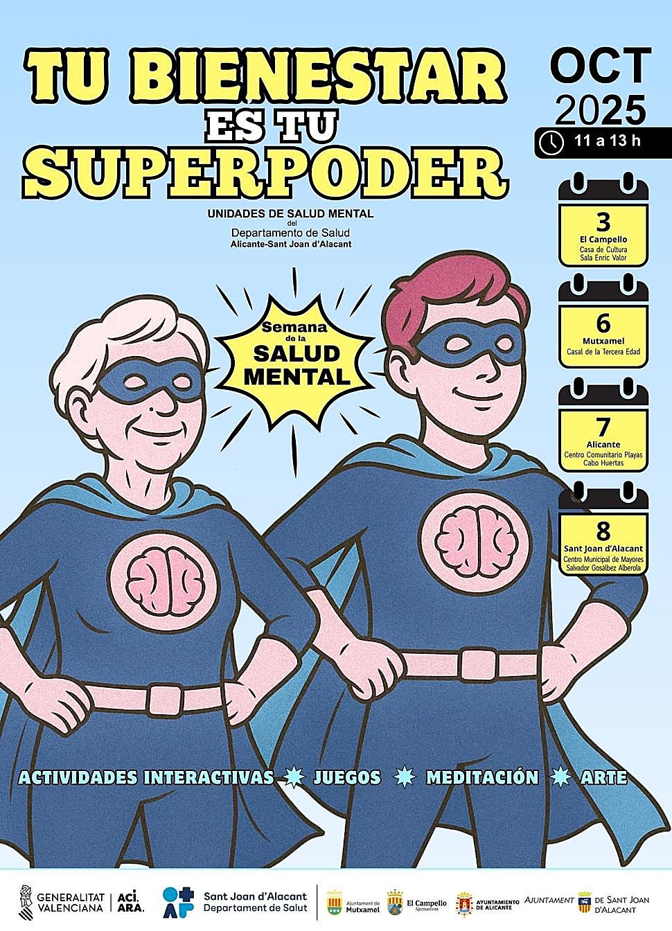 La propuesta se enmarca en la conmemoración del Día Mundial de la Salud Mental, que tiene lugar el 10 de octubre, y se desarrollará en los municipios de El Campello, Mutxamel, Cabo Huertas y Sant Joan d'Alacant. El lema elegido, 'Tu bienestar es tu superpoder', resume el espíritu de unas jornadas abiertas a toda la población, en las que se han previsto actividades participativas como juegos, talleres artísticos, sesiones de meditación y dinámicas grupales.